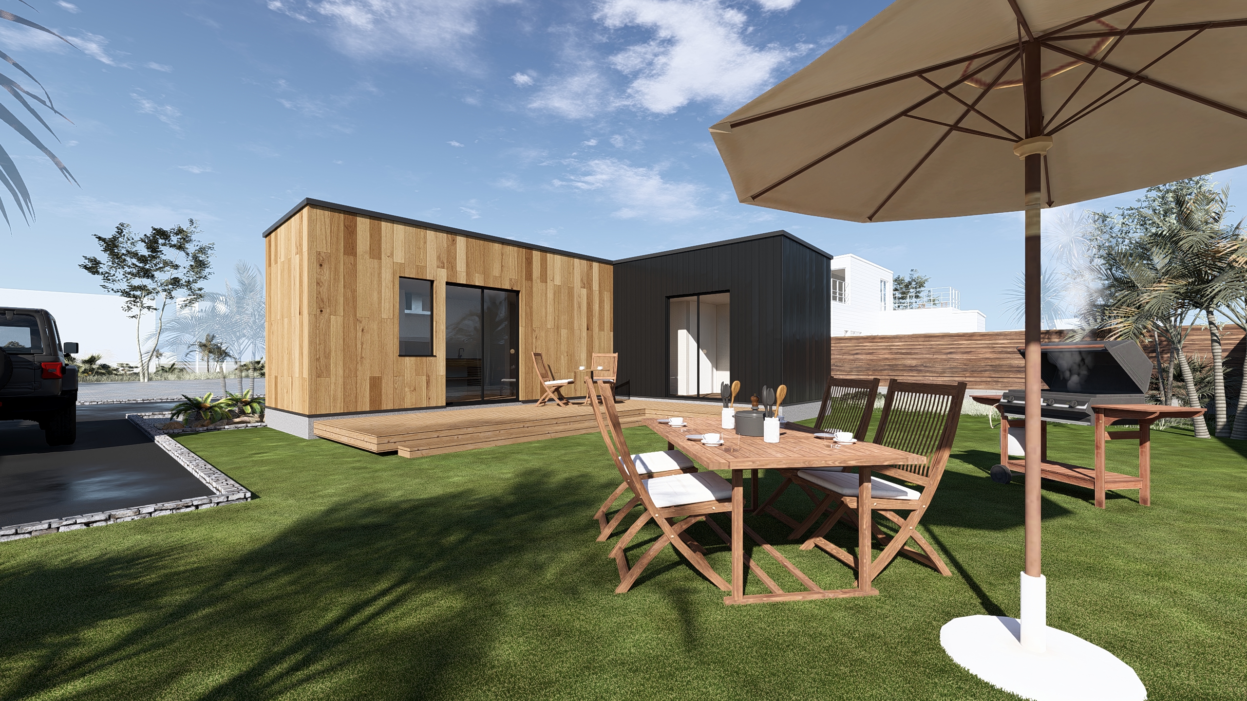 2つのモジュールをL字型に配置することで、周囲の視線を遮りながら光と風を取り込む、プライベートなデッキスペースが生まれます。室内とデッキがシームレスに繋がり、境界のない空間が広がります。