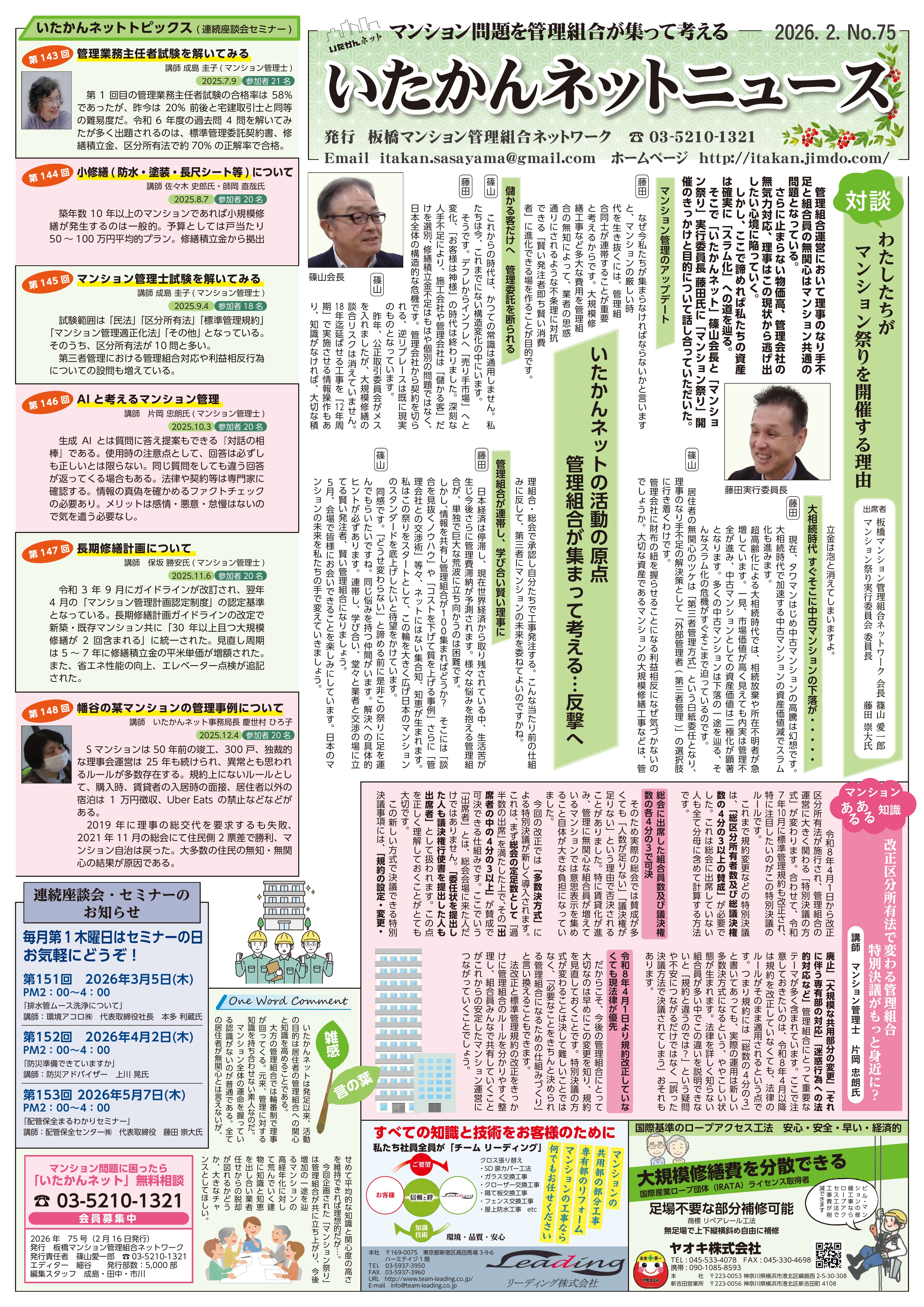 板橋マンション管理組合ネットワーク(略称:いたかんネット)は、2003年6月に板橋区で発足したマンション問題の民間ボランティア団体です。管理組合が業者任せにせず自立した管理を実現できるよう、20年以上にわたって居住者の関心と知識を高める活動を続けています。毎月第1木曜日に連続座談会・セミナーを開催し、5,000部のニュースレターを発行するなど、地道で信頼性の高い活動が評価されています。