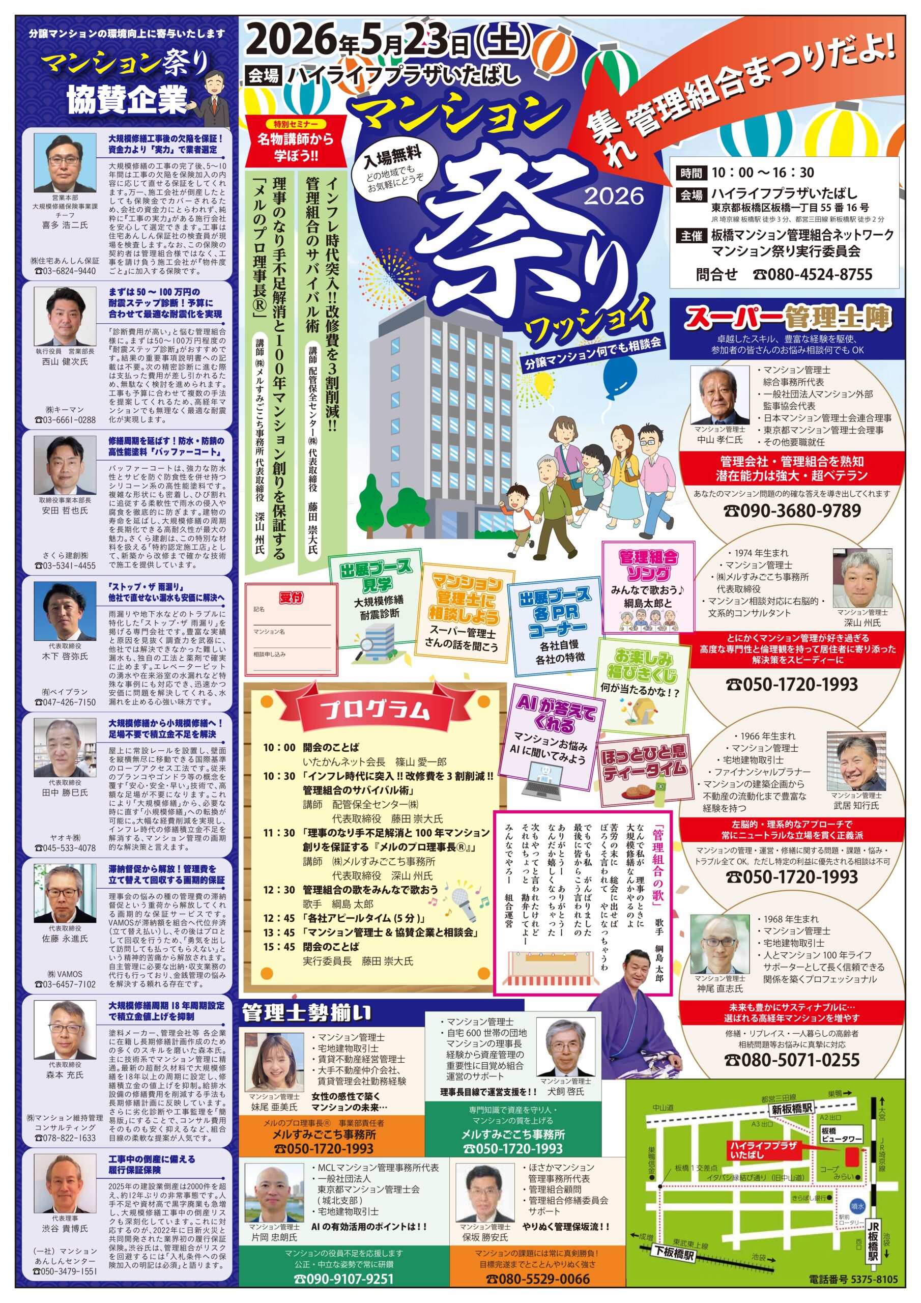 板橋マンション管理組合ネットワーク(略称:いたかんネット)は、配管保全センター株式会社(本社:東京都千代田区、代表取締役:藤田崇大)と共同で、分譲マンションの理事会・修繕委員会の皆さまを対象としたイベント「第1回 マンション祭り2026」を、2026年5月23日(土)にハイライフプラザいたばし(東京都板橋区)にて開催いたします。