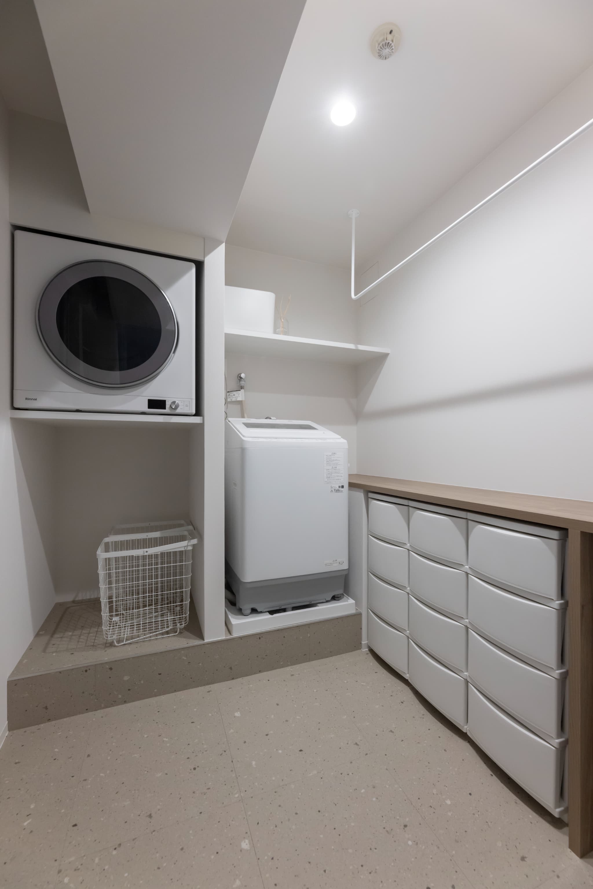 ランドリールームには室内干し用のパイプや可動棚を配置し、洗濯〜収納までをひとつの場所で完結。家事が効率よく行えるだけでなく、日常の動きがスムーズになり、暮らしの快適さを格段にアップさせています。