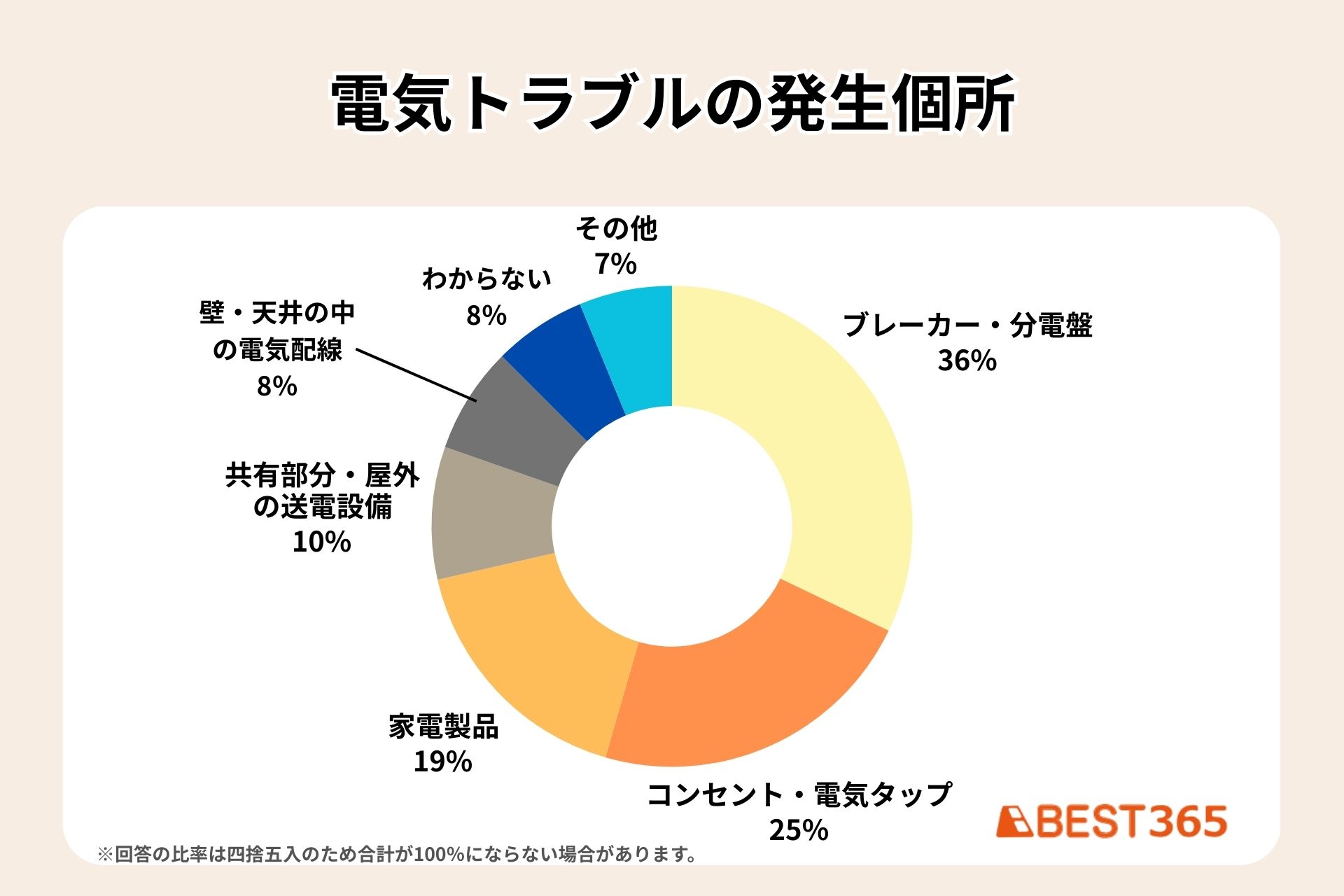 電気トラブルは実際にどこで最も頻繁に起きるのか、想定では使用頻度が高く、生活環境に露出している「コンセント・電気タップ」でしたが、アンケート結果で一番多いのは「ブレーカー・分電盤」でした。
