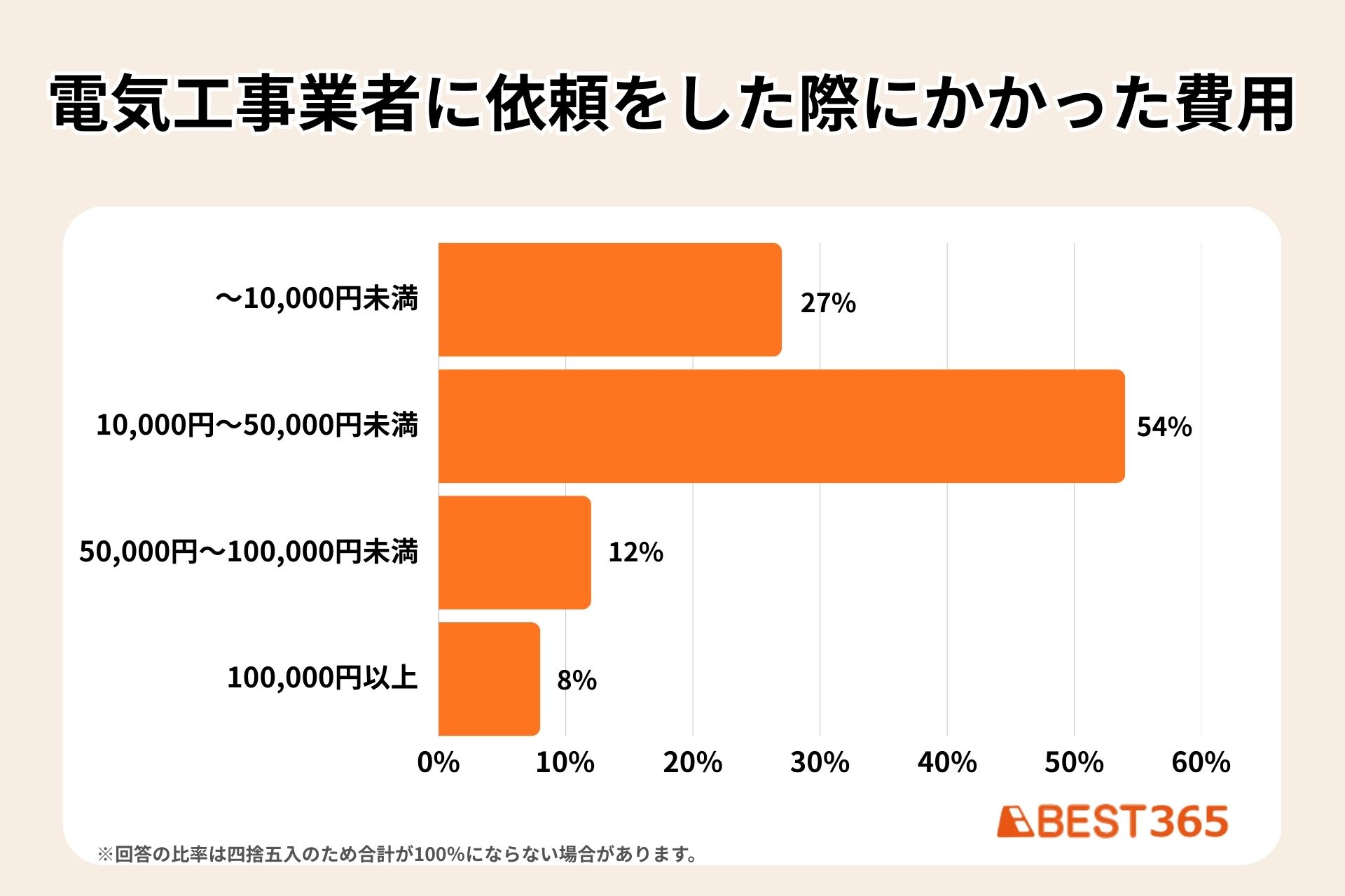 一方で、突発的な電気トラブルに見舞われた場合、プロに修理交換等の作業を依頼すると多くの方が10,000円~50,000円かかることが分かりました。