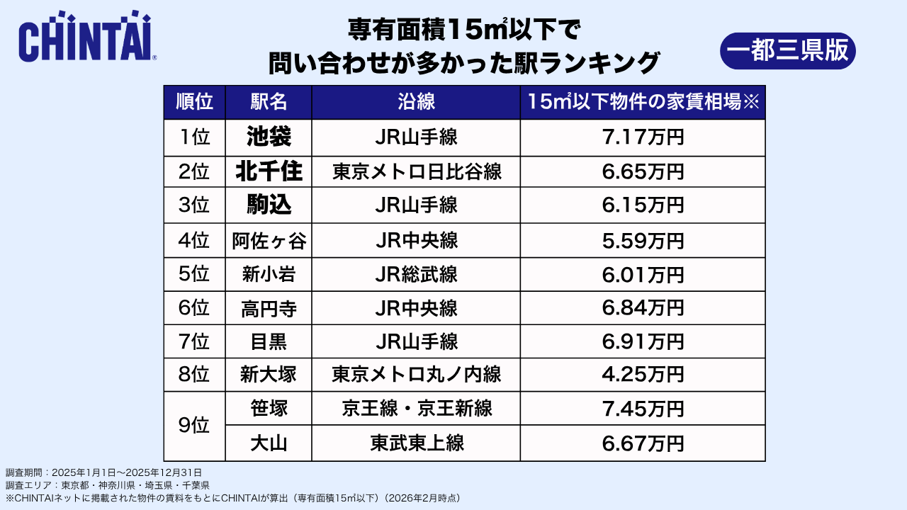 お部屋探しのリーディングカンパニー株式会社CHINTAI(本社:東京都港区 代表取締役社長 奥田倫也、以下CHINTAI)は、『CHINTAIネット』に掲載された東京都、神奈川県、埼玉県、千葉県の賃貸物件のうち、専有面積が15㎡以下および45㎡以上の物件において問い合わせが多かった駅を集計し、それぞれランキング化しました。