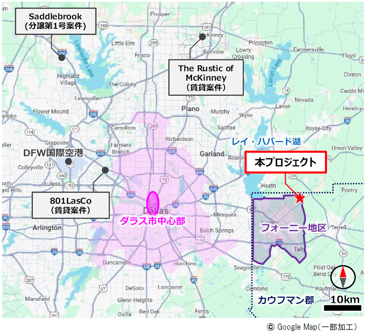 本プロジェクトの計画地は、ダラス市中心部から東へ40kmほど離れたカウフマン郡フォーニー地区に位置しています。フォーニー地区は高速道路の出入口も近く、ダラス市中心部までは車で約35分とアクセスが良いことから、生活利便性に優れたベッドタウンとして人気のあるエリアです。また、インフラ整備も積極的に進められており、商業施設や教育施設、医療施設なども充実しているエリアです。