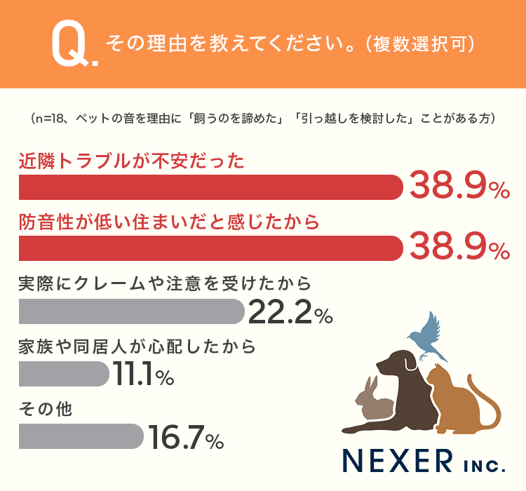 最も多かったのは「近隣トラブルが不安だった」と「防音性が低い住まいだと感じたから」で、それぞれ38.9%でした。続いて「実際にクレームや注意を受けたから」が22.2%、「家族や同居人が心配したから」が11.1%、「その他」が16.7%となっています。