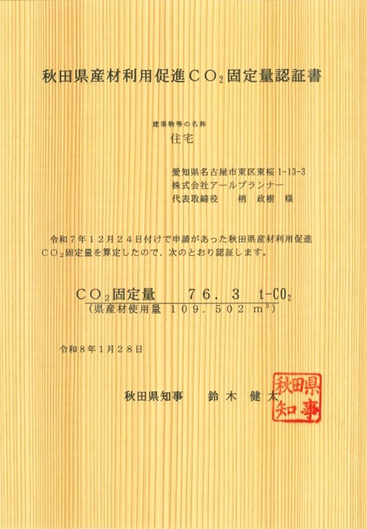 戸建住宅を中心とした住宅プラットフォーム事業を展開する株式会社アールプランナー(本社:名古屋市東区、代表取締役社長:梢 政樹、以下「当社」)は、2026年1月28日に秋田県知事より「秋田県産材利用促進CO2固定量認証書」を受領いたしました。