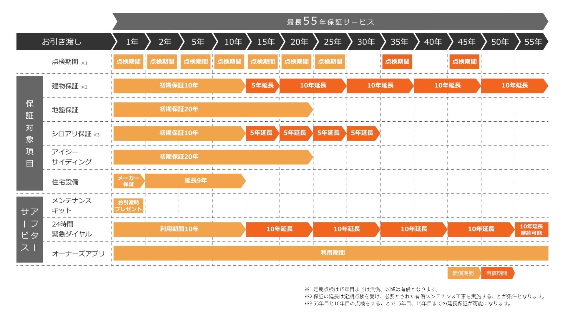 1. 最長55年の長期保証: 構造・防水の安心を半世紀以上にわたってサポート。