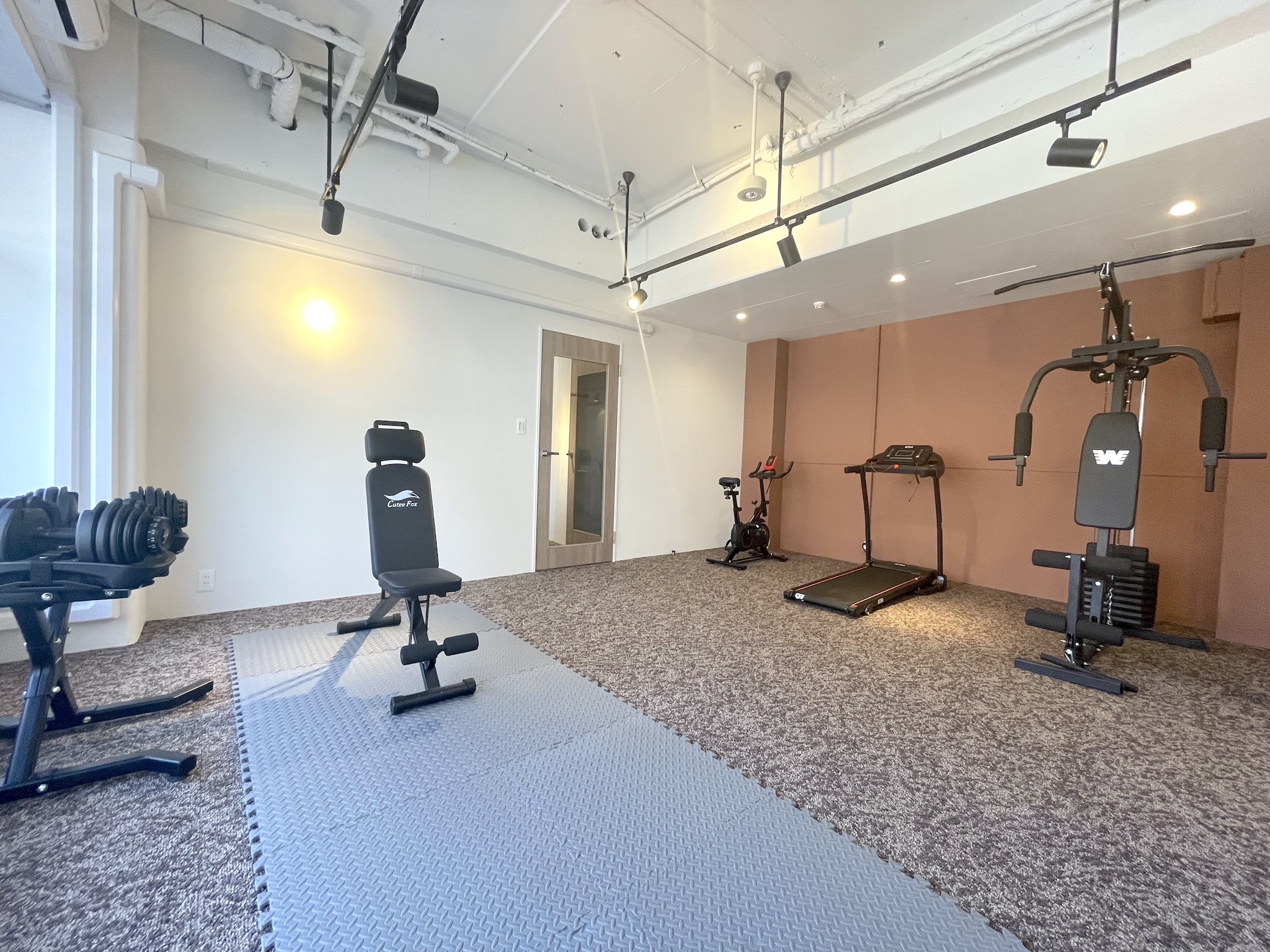 WEBミーティング対応の個室ブースを備えたワークスペースを設置。ランニングマシン・ベンチ・ダンベルなどを完備した本格的なフィットネスルームも利用可能。リモートワーカーから試験勉強中の学生まで、日常的に使えます。