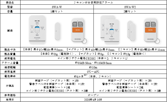 アイリスオーヤマ株式会社(本社:宮城県仙台市、代表取締役社長:大山 晃弘)は、窓ガラスに貼るだけで手軽に窓からの侵入・防犯対策ができる「リモコン付き窓用防犯アラーム」を、2026年4月16日より、全国のホームセンターおよびインターネットサイト、家電量販店を中心に順次発売(※1)します。
