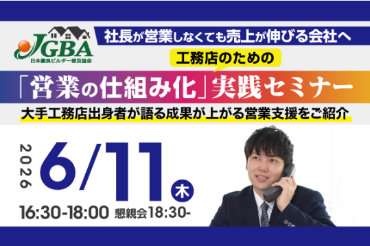 イベント名:JGBA 『社長が営業しなくても売上が伸びる会社へ 工務店のための「営業の仕組み化」実践セミナー』