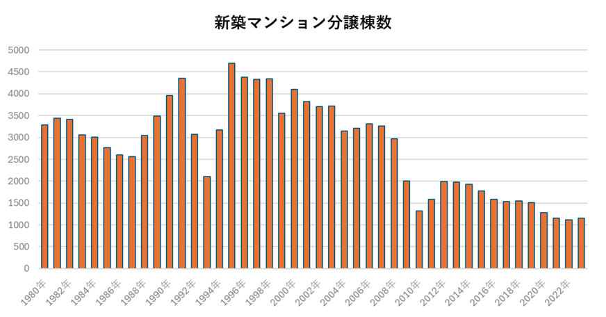 このような建築コストの上昇に加え、マンション開発においては用地取得の難易度も年々高まっています。特に都市部においては、優良な立地の用地はすでに開発され尽くされつつあり、新規の開発用地は競争入札によって取得価格が高騰しやすい状況です。一方で地方都市に目を向けると、人口動態や需要の見通しを踏まえた際に、そもそも開発自体の成立性が厳しくなるケースも増えています。こうした背景から、日本全体として新築マンションの竣工棟数は減少傾向にあり、供給の絞り込みが進んでいるのが実情です。