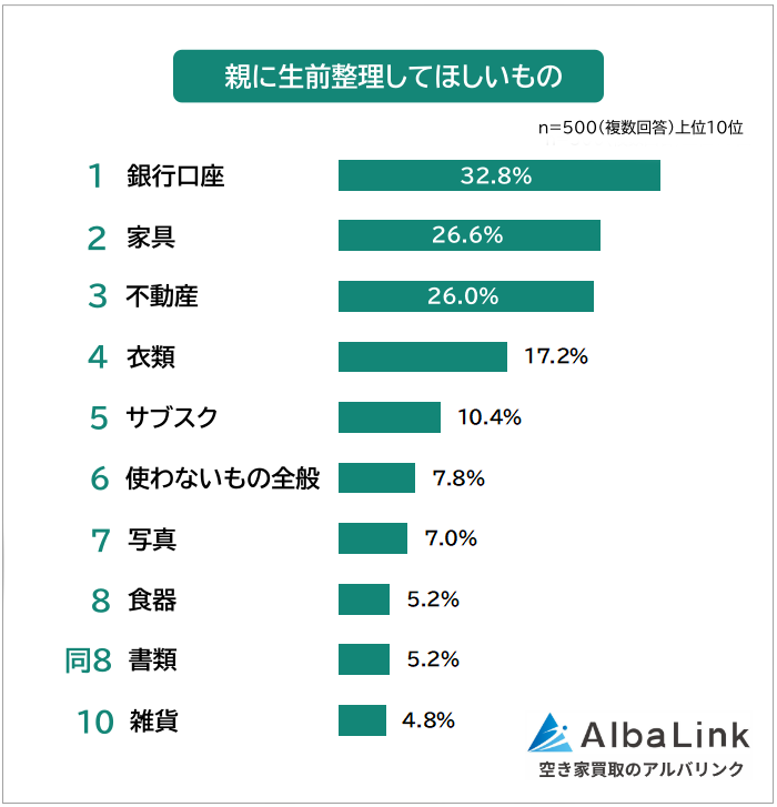 今回、株式会社AlbaLink( https://albalink.co.jp/ )が運営する空き家買取隊( https://akiya-kaitoritai.com/ )は、全国の男女500人を対象に「親に生前整理してほしいもの」についてアンケート調査を実施しました。