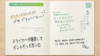 ひとり暮らしのリアルな声が書き込まれているオンライン交換ノートです。ひとり暮らしで、ふと誰かに共有したいタイミングにつながれることを実現したノートで、ページ毎にさまざまなカテゴリーでリアルボイスが表示されます。これまでのリサーチをもとに「独りじゃない、ひとり暮らし」を具現化した、パイロット作品です。