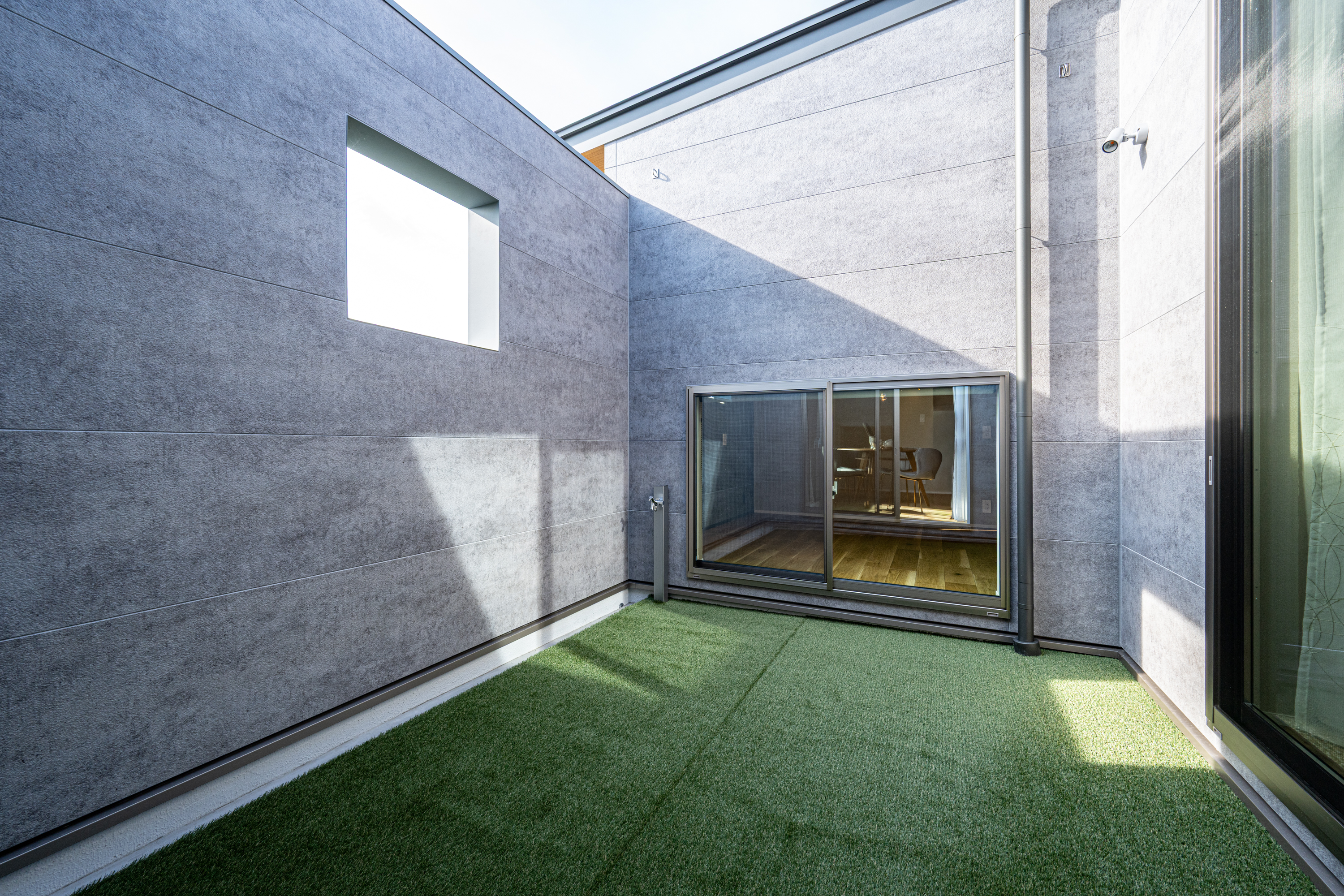 勾配天井やリビングとつづく中庭でさらに開放的に。ランドリースペースからWICへつながる家事ラク動線や、ペットと暮らすことも想定してきた間取りなど、人間も植物も快適に暮らせる工夫を施した家です。