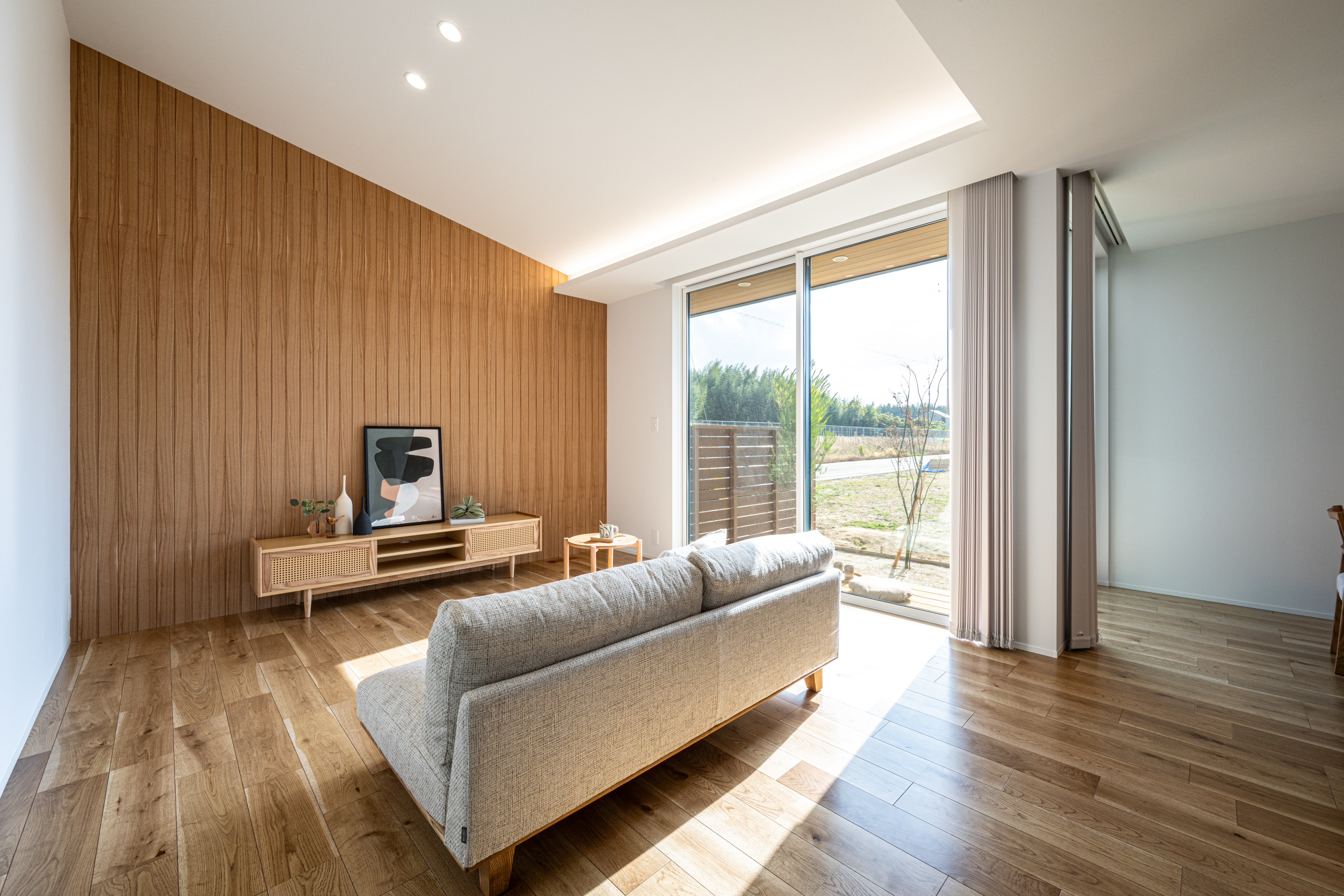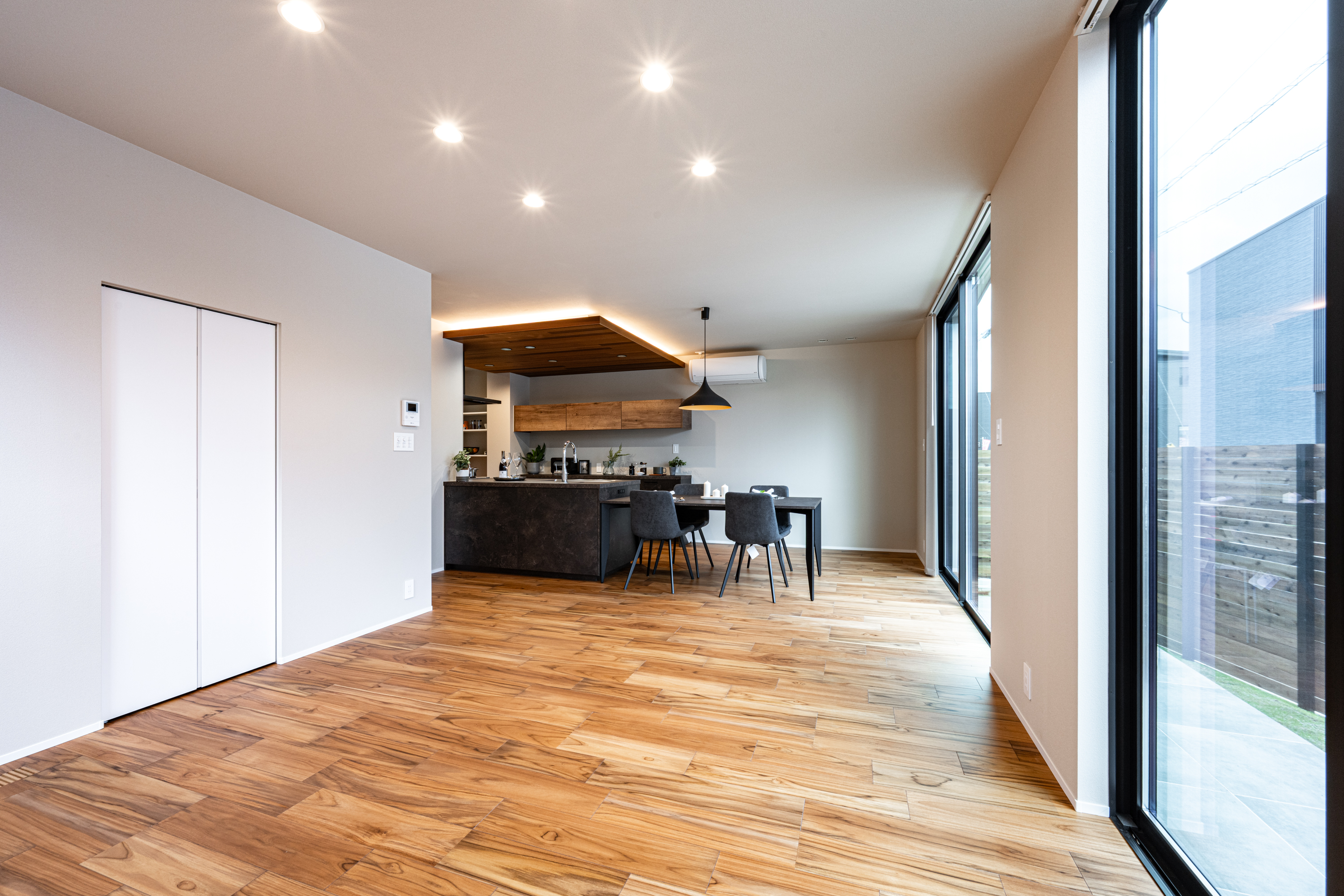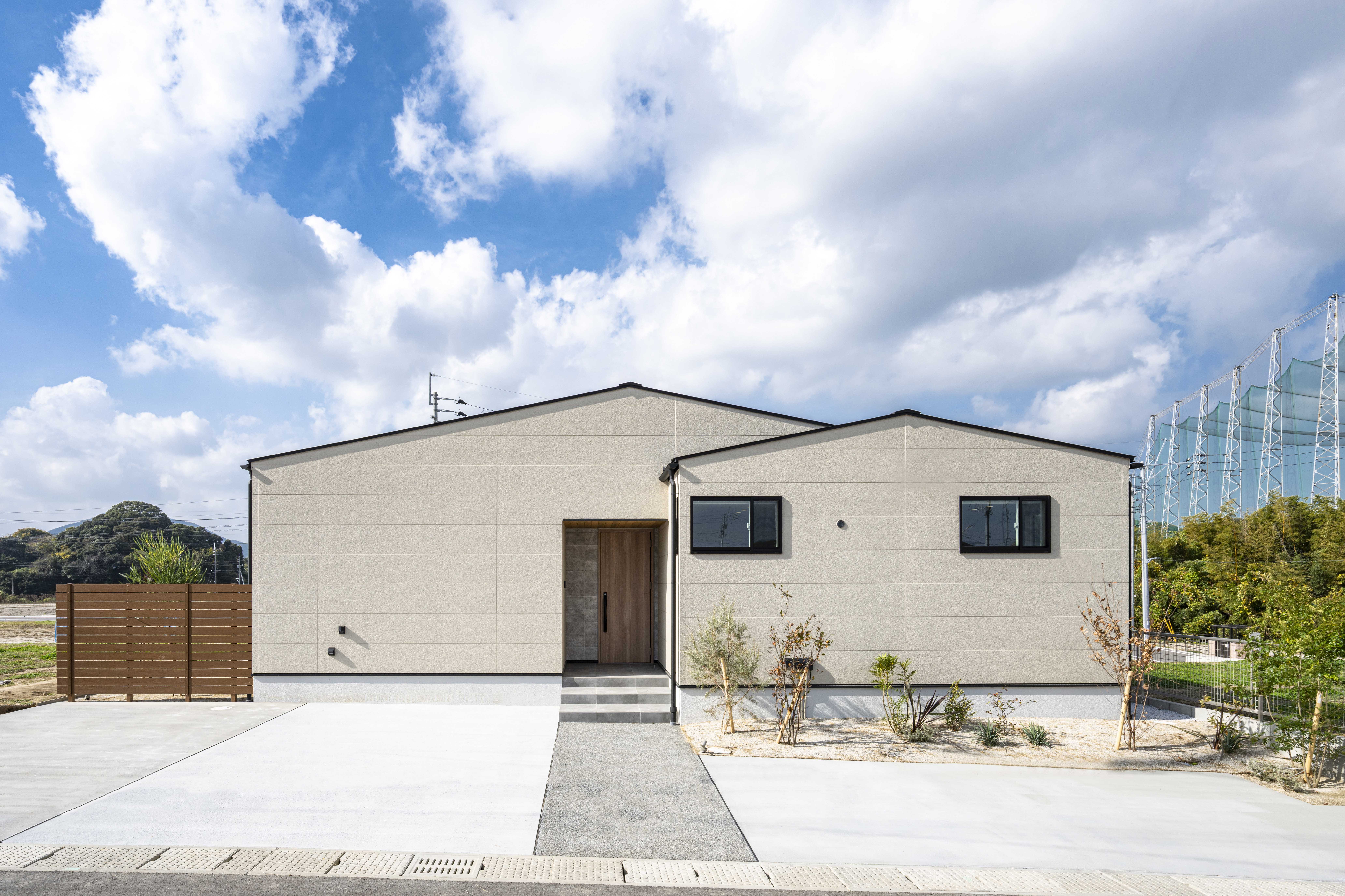 質感の異なる2つの素材を組み合わせた立体感のある外観の平屋。LDKは約21帖の広々空間。
