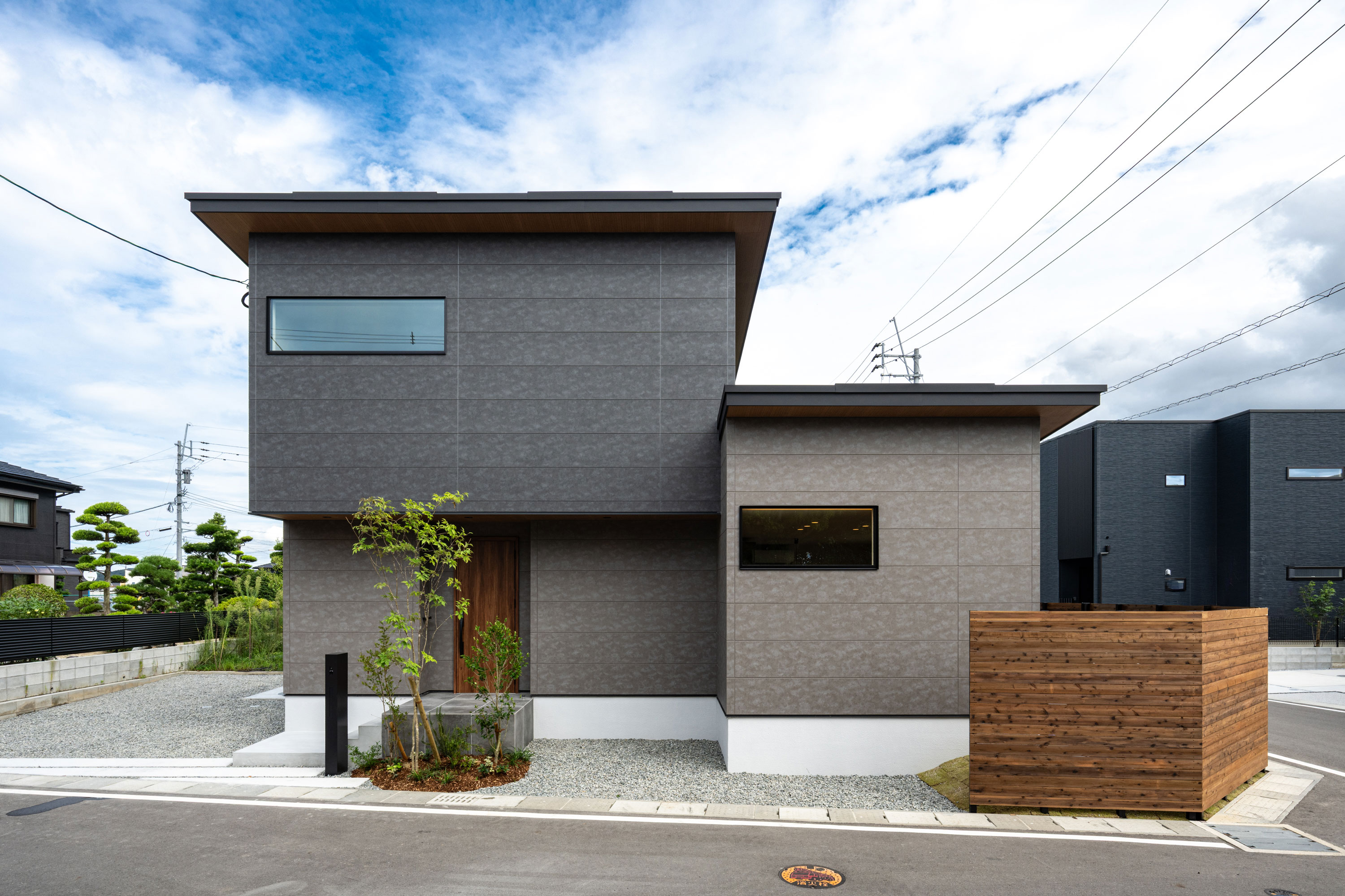 ダークグレーを基調とした落ち着きのある佇まいの外観。内装は外観と調和するスタイリッシュな空間デザイン。キッチンは家具のように空間に馴染むグラフテクトを採用し、より洗練されたLDK空間に。水回りの動線計画もスムーズで、日々の家事負担を軽減。暮らしの質を高めるアイデアが随所に盛り込まれています。