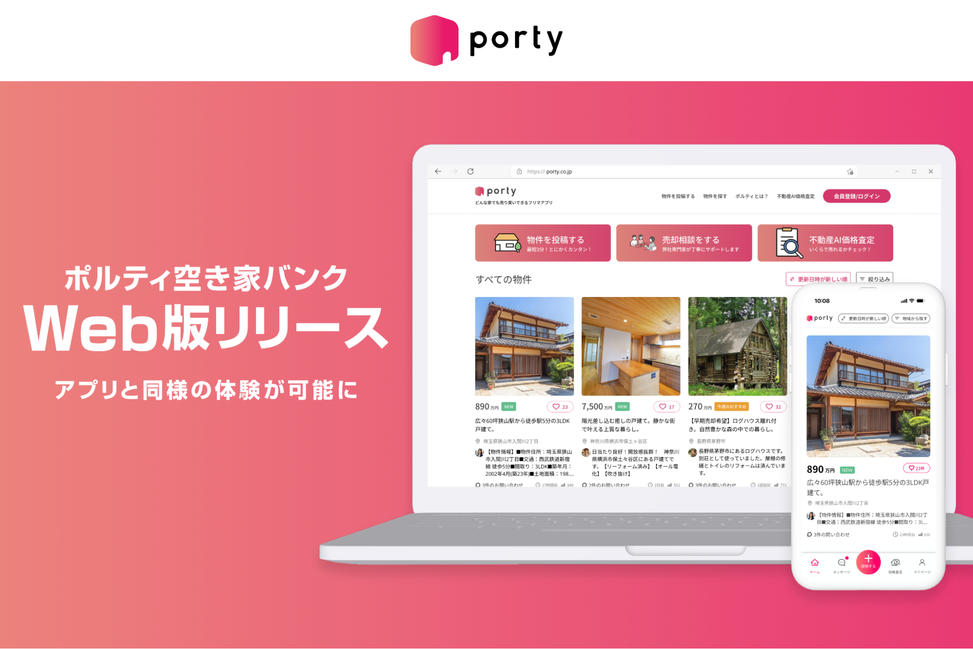 「ポルティ空き家バンク」では、これまで個人間のマッチングを中心にサービス展開してきました。加えて今後は、プロの不動産投資家に向けた流通チャネルの開拓も強化してまいります。その一環として、PCから物件を一覧・比較・問い合わせしやすいWeb版(https://porty.co.jp/)も正式リリースいたしました。