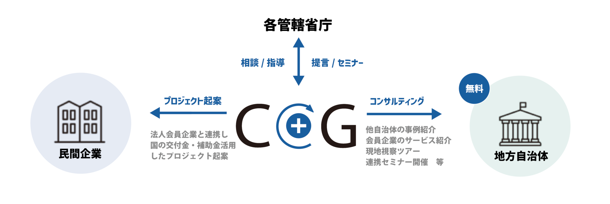 一般社団法人公民連携推進機構(C+G)は、自治体と民間企業の連携を前に進めるため、接点づくりから実務支援までを一体で行っています。地方自治体の活性化に向けて、民間企業の活力・資金や国の交付金・補助金を活用する枠組みを持つ非営利組織です。