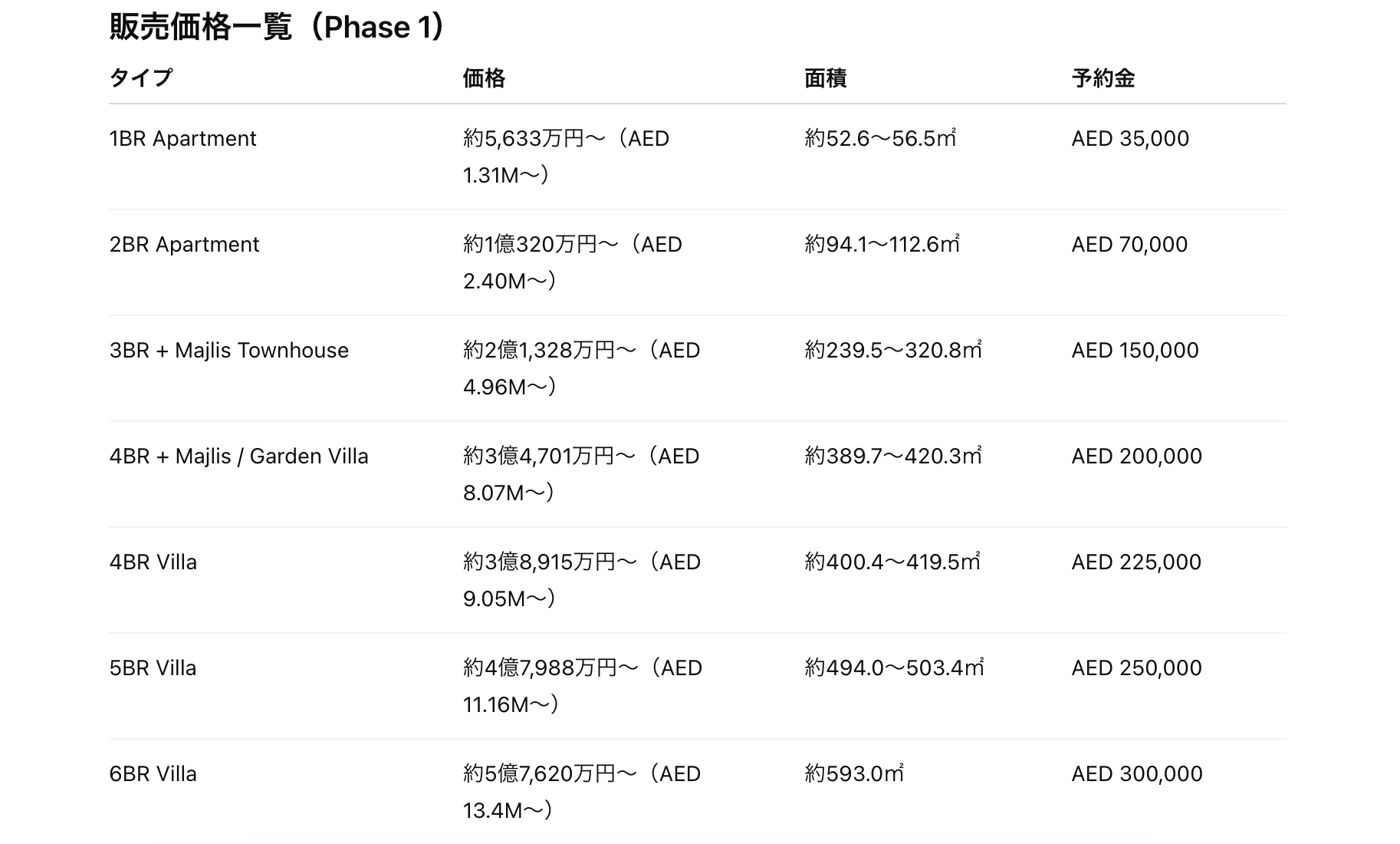 今回発表された Phase 1 の供給戸数は以下の通りです。