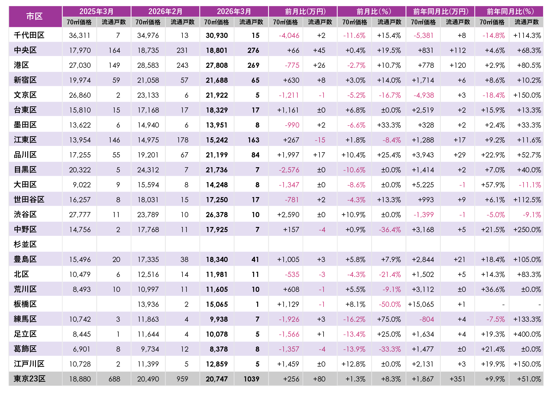 2026年3月に中古流通した東京23区と大阪市の行政区別データです。