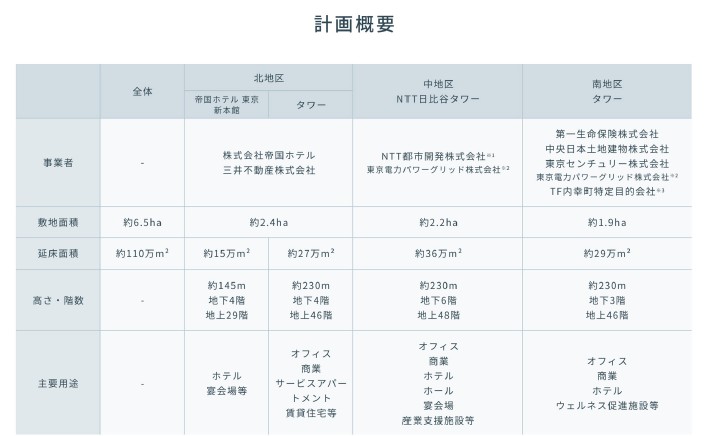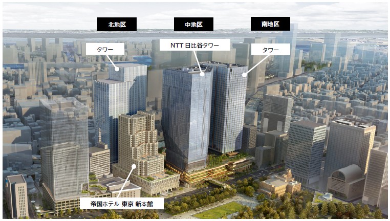 本プロジェクトは北地区・中地区・南地区の3つの地区で構成されており、オフィス、商業、ホテルなどの多様な用途から構成される、都心最大級延床面積約110万㎡の大規模複合開発です。全体完成に向けて、2028年度に南地区のタワーが、2031年度に中地区のNTT日比谷タワーが順次竣工予定です。
