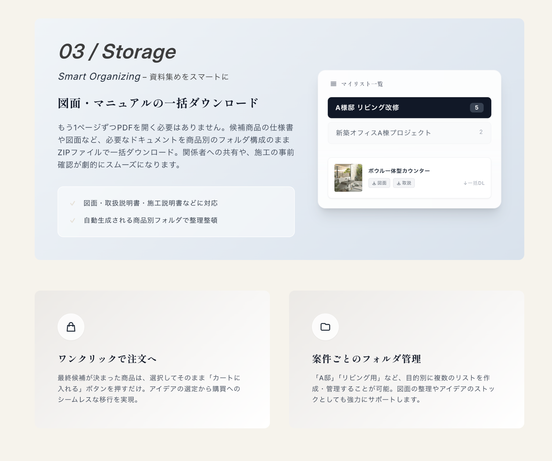 ② プロの実務を助ける「提案書&図面の一括ダウンロード」 プロの皆様は、検討リストから1クリックで「美しいプレゼンボード(PDF)」を出力可能。さらに、現場の施工管理に欠かせない「各機器の寸法図や承認図」を、一つ一つ探すことなく一括でダウンロードできます。Crafree製品で揃えれば、カタログの切り貼りや図面探しの手間がなくなり、本来のデザイン業務に集中できます。