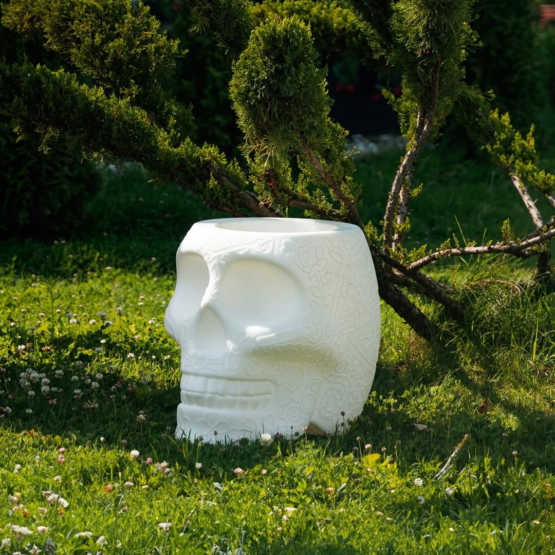 メキシコの「カラベラ(彩色ドクロ)」をモチーフとしたプロダクト。2017年のミラノデザインウィークで発表され、命の循環を祝うメキシコの祝祭文化をインテリアとして表現した意欲的なシリーズです。スツール&サイドテーブルとプランター&シャンパンクーラーで使用可能な多用途設計が特徴です。仕上げはポリエチレン版・ベルベットフィニッシュ版・充電式LEDランプ版のバリエーションを展開します。共通サイズは幅38 × 奥行53 × 高さ45cm。ランプ版は16色のRGB切り替えとリモコンに対応しています。