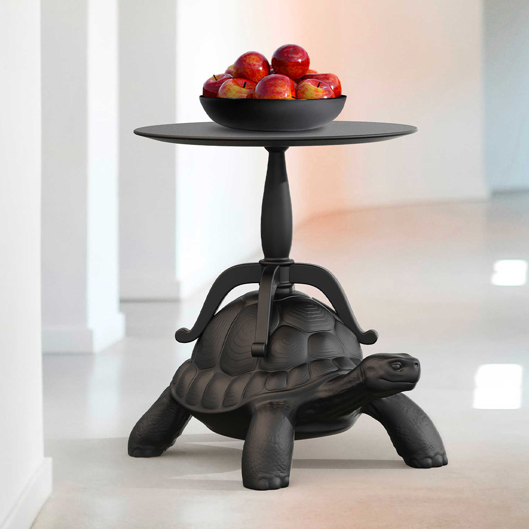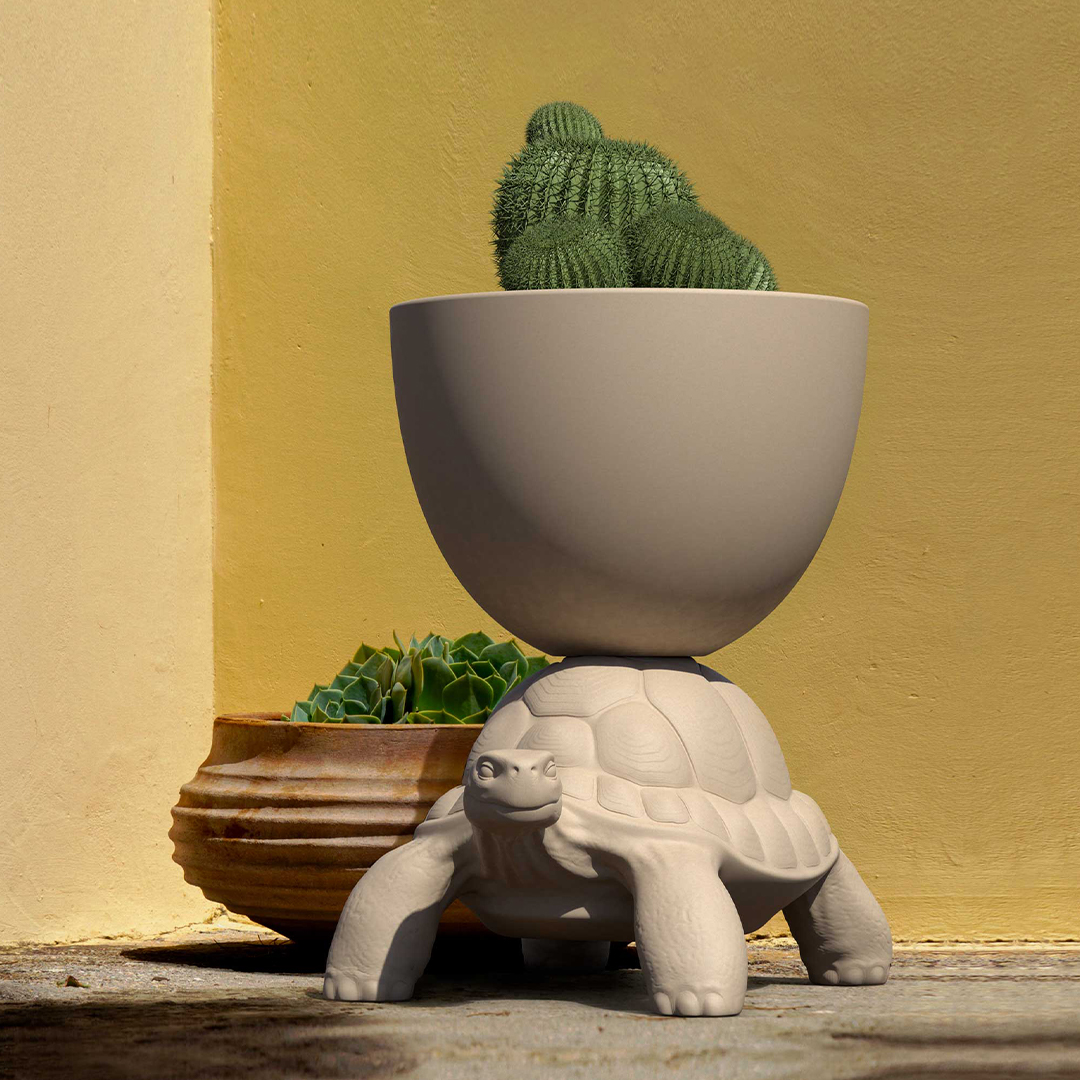 タートルキャリーコレクションは、カメ型の多用途インテリアシリーズです。カメの甲羅を台座として、ブックケース、コーヒーテーブル、プフ、プランター兼シャンパンクーラー、ベッドサイドテーブル、XSシリーズ3種の計8アイテムを展開します。大型モデルはリサイクル可能なポリエチレン製、XSシリーズはセラミック製です。自然界の生き物に宿るユーモアと機能を共存させる、マルカントニオならではのアプローチが全アイテムに貫かれています。