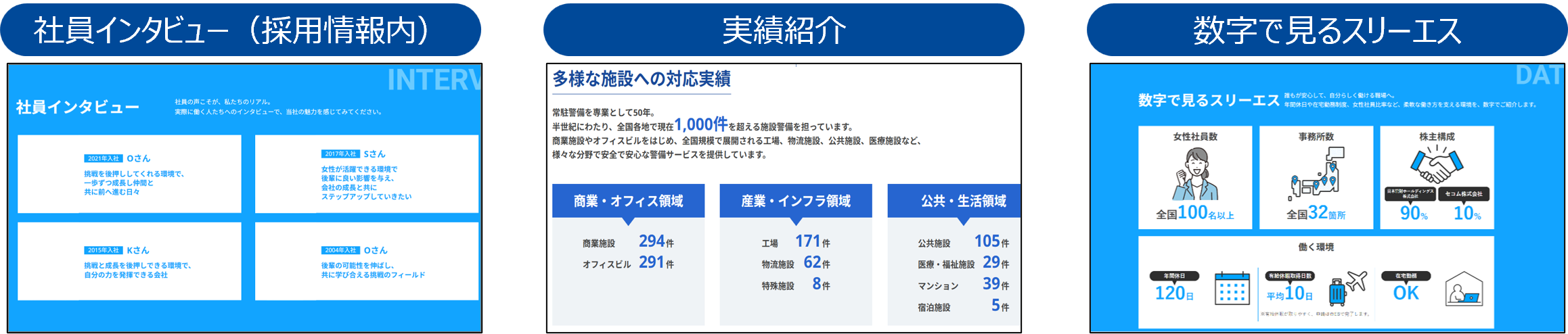採用ページでは、社員インタビューを通じて現場で働く社員のリアルな声や、安心して働ける環境を支える体制づくりを紹介しており、求職者の皆さまがスリーエスでの働き方を具体的に思い描けるよう工夫しています。