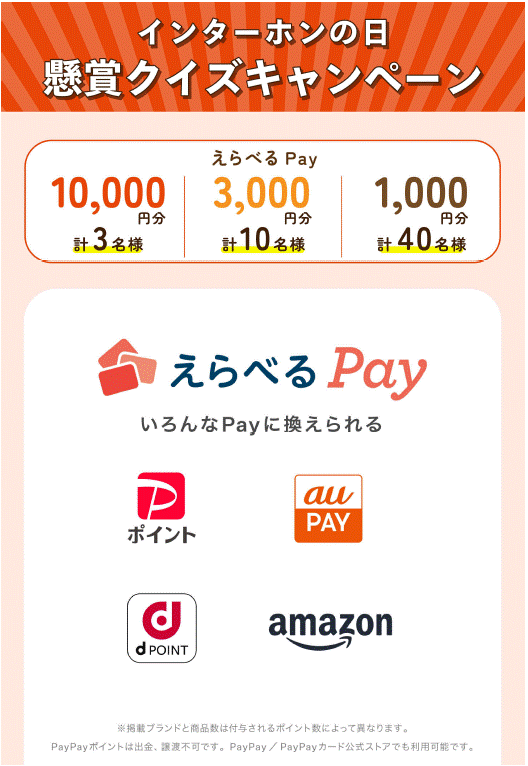 ※「えらべるPay ®」は、株式会社ギフティが提供するデジタルギフトであり様々なスマホ決済サ-ビスポイントの中から贈呈された「ギフトボイント」内でお好きな商品と交換することができます。「えらべるpay®」および「ギフトボイント」の利用には会員登録やアプリダウンロードの必要もなく、保有ポイント内で複数の決済サービスポイントを選ぶことも可能です。 PayPayポイントは出金、譲渡不可です。PayPay/PayPayカード公式ストアでも利用可能です。 「au PAY」は、KDDI株式会社の商標です。本キャンペーンは【一般社団法人 インターホン工業会】による提供です。 本キャンペーンについてのお問い合わせは Amazon ではお受けしておりません。インターホンの日キャンペーン係【kinen-bi@jiia.gr.jp】までお願いいたします。Amazon、Amazon.co.jp およびそれらのロゴは Amazon.com, Inc.またはその関連会社の商標です。