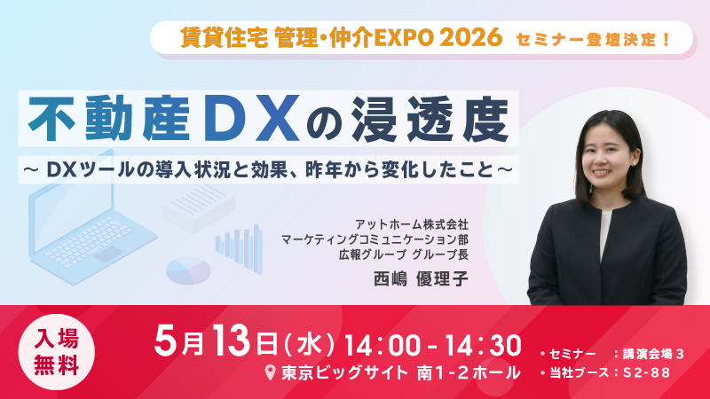 不動産情報サービスのアットホーム株式会社(本社:東京都大田区 代表取締役社長:鶴森 康史 以下、アットホーム)は、住まい・建築・不動産の総合展[BREX] 実行委員会主催の「賃貸住宅 管理・仲介EXPO 2026」に登壇いたします。本イベントでは、マーケティングコミュニケーション部広報グループ グループ長の西嶋 優理子が不動産DXの浸透度について解説いたします。なお、会期中はブース出展も行います。
