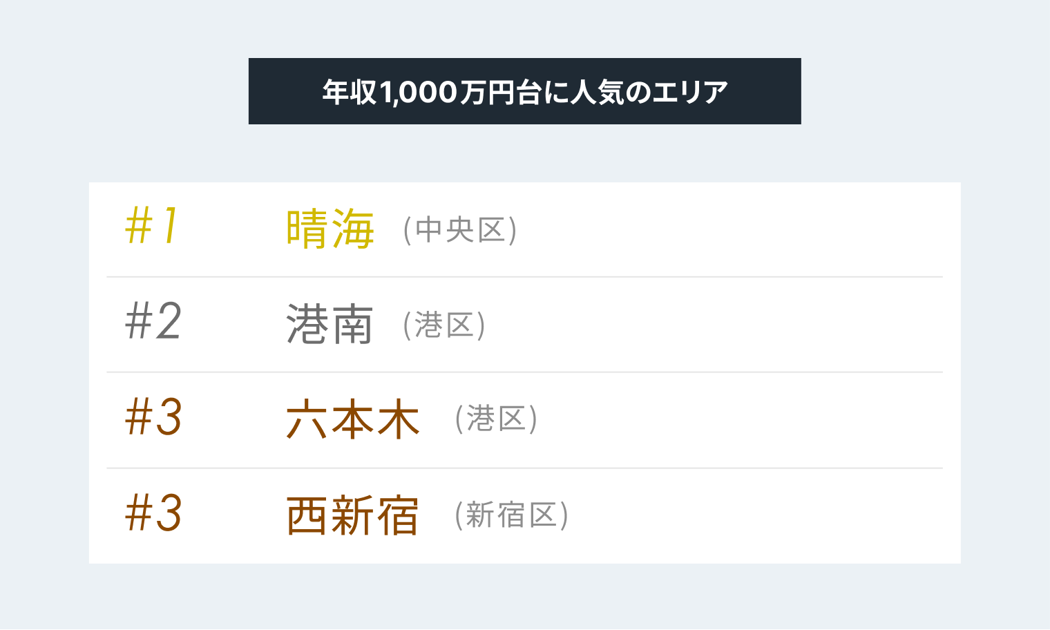 「晴海」や「西新宿」が共通して上位にランクインする一方、2,000万円超では「赤坂」「神宮前」が同率1位となるなど、高年収帯特有の居住傾向が顕著に現れました。
