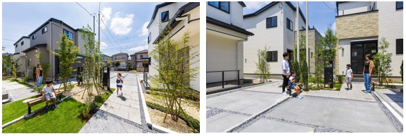 住民同士が自然とお互いを意識できる安心・安全な暮らし方を提案した30邸の分譲住宅です。道路に面した整形地と旗竿地が連続した区画となっており、通常の計画では余白にある「スキマ」は有効活用されず、アプローチとして完結してしまいます。そこで、敷地境界をシームレスにして、1戸では「スキマ」だった空間同士をつなげることで、広場となる「コア」へ昇華させました。「コア」は、樹木を中心とした空間を基本とし、ベンチ等を設置し、住民が立ち寄りたくなる工夫を施すことによって、自然なコミュニティの形成を促します。