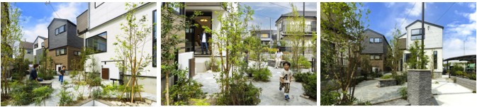 敷地延長部分のアプローチ空間を共有地として活用した3邸の分譲住宅です。2本の敷地延長によって接道する奥まった敷地は、本来であればデッドスペースになりやすい長い通路状の区画となりますが、本計画ではアプローチ部分にカースペース、共有広場、駐輪場を配置し住民全員が利用できるコモンスペースとして計画しました。広場にはベンチ、豊かな植栽、照明を設けることで美しい景観と住民の憩いの場を創出しています。