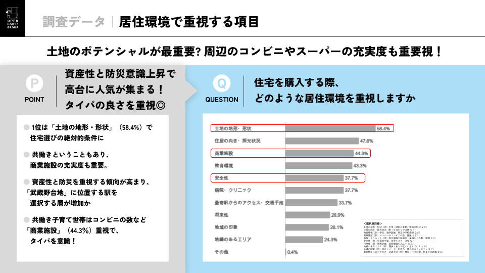「住宅を購入する際、居住環境のどのような要素を重視しますか」と各設問で例を挙げて聞いたところ、1位は「土地の地形・形状」(58.4%)となりました。昨年のアンケートでも圧倒的1位となっており、【住宅選びの絶対的条件】となっていることが伺えます。人気路線ランキング1位の山手線、3位の中央線沿いの土地は「武蔵野台地」に位置する駅が多く資産価値の高さに加えて、災害リスクの意識が高い点も評価されている理由の1つのようです。また、共働き世帯だからこそ「商業施設」も3位に入り(44.3%)、スーパーやコンビニとの距離や数といった買い物の利便性を重視することが分かりました。