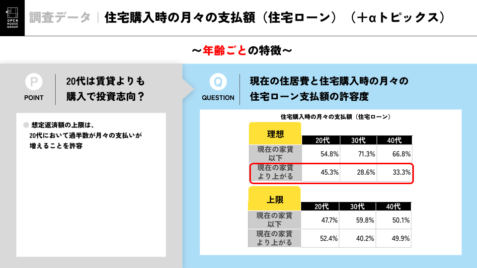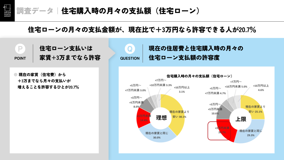 ・現在の家賃(住宅費)から+3万までなら月々の支払いが増えることを許容するひとが20.7%