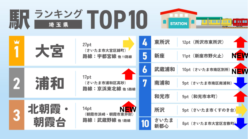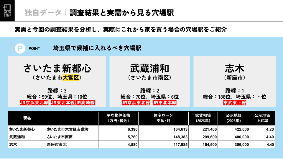 埼玉県はTOP10にすでにTOP10入りした駅の中から穴場駅だと思う駅を2駅と、TOP10外で追加する場合の1駅を候補に挙げました。