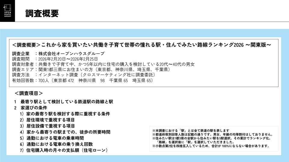 株式会社オープンハウスグループ(本社:東京都千代田区、代表取締役社長:福岡 良介、以下「当社」)は、「これから家を買いたい共働き子育て世帯が住みたい駅・路線ランキング2026 ~関東版~」の調査結果を発表いたしました。また、土地の仕入れから設計・建築・販売までを一貫して手掛ける「製販一体」の体制を持つ当社ならではの視点から、不動産のプロが選ぶ「これから注目すべき穴場駅」についても併せてご紹介しております。