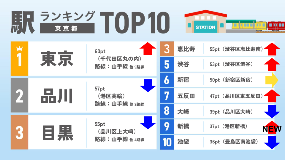 駅と駅周辺の再開発が進む東京が1位に。山手線南側・東側の資産価値が高いエリアは変わらず人気です。