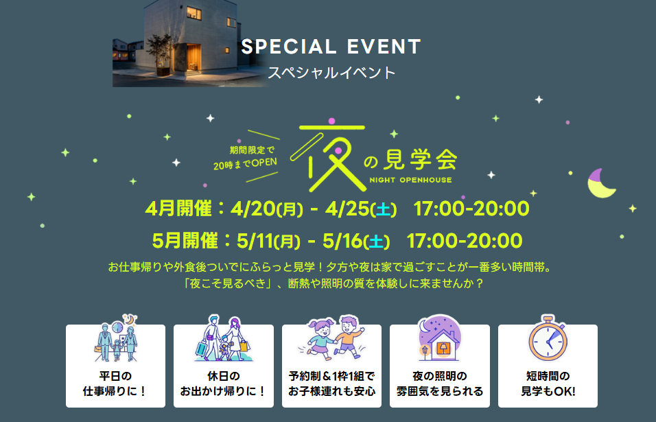 好評公開中の本モデルハウスにて、4月から5月の期間、「夜の見学会」を開催いたします。