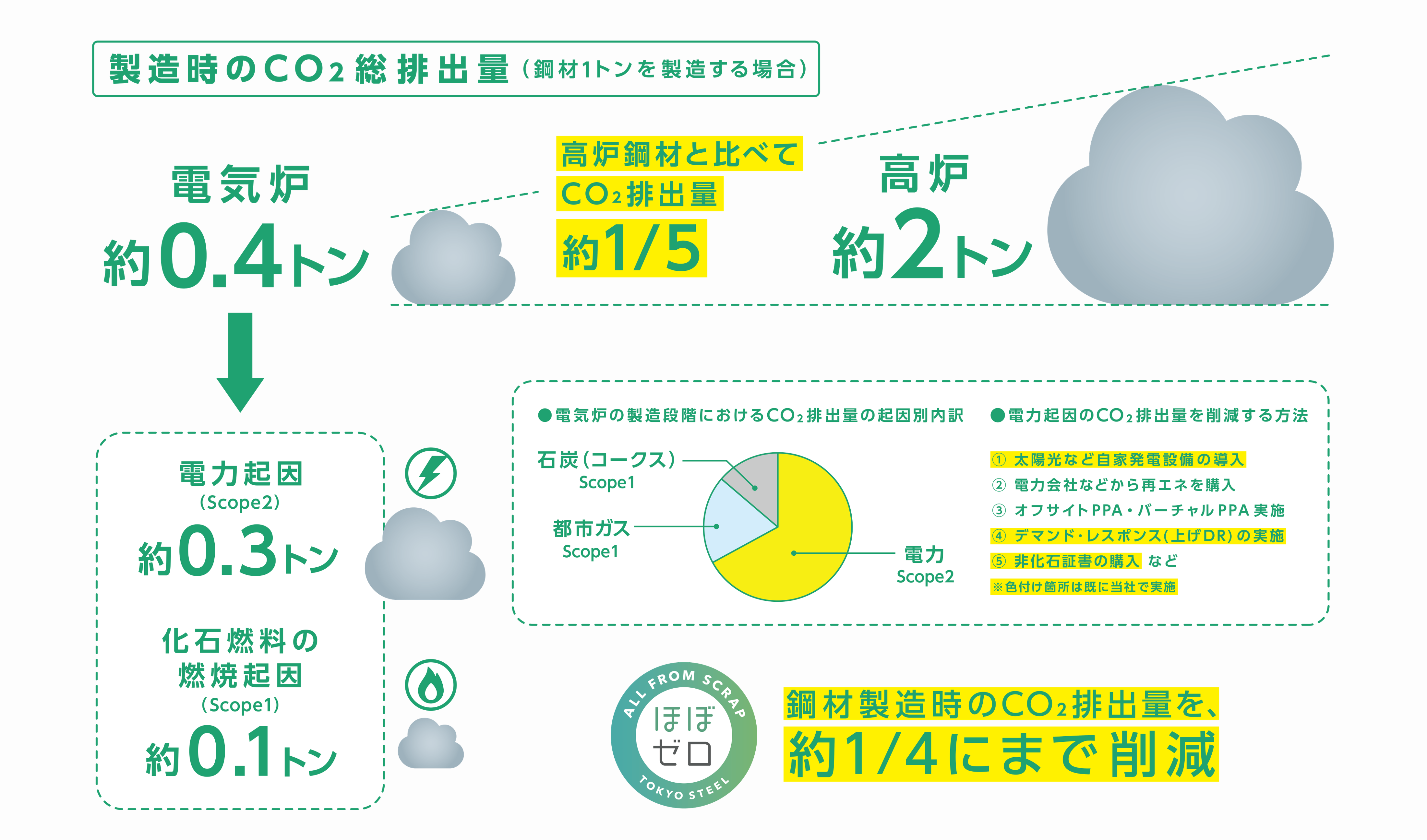 「ほぼゼロ」は、再生可能エネルギーを活用した電炉製法により、製造時のCO2排出量を従来の電炉鋼材比で約75%削減(1トンあたり0.4トン→0.1トン)した鋼材です。第三者機関による妥当性確認を経て、客観的な環境性能が認められています。