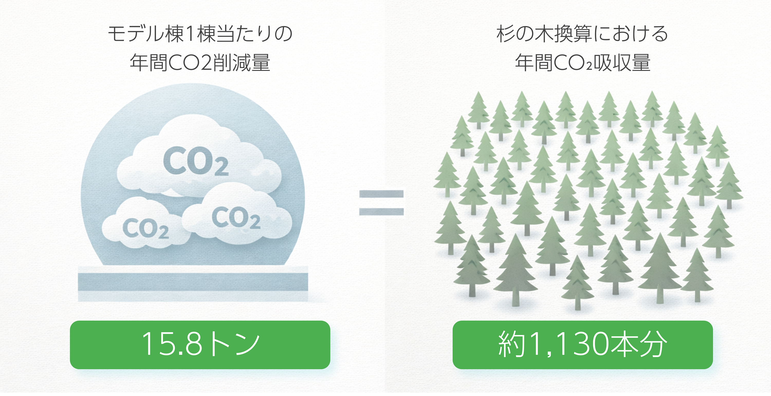 モデル棟(18世帯)では、躯体製造段階のCO2排出量を約67.9トンから約52.1トンへ削減します。年間約100棟に適用することで、年間約1,580トンの削減効果を見込みます。これは、杉の木約11.3万本分の年間吸収量に相当し、大規模なCO2削減効果を示すものです。