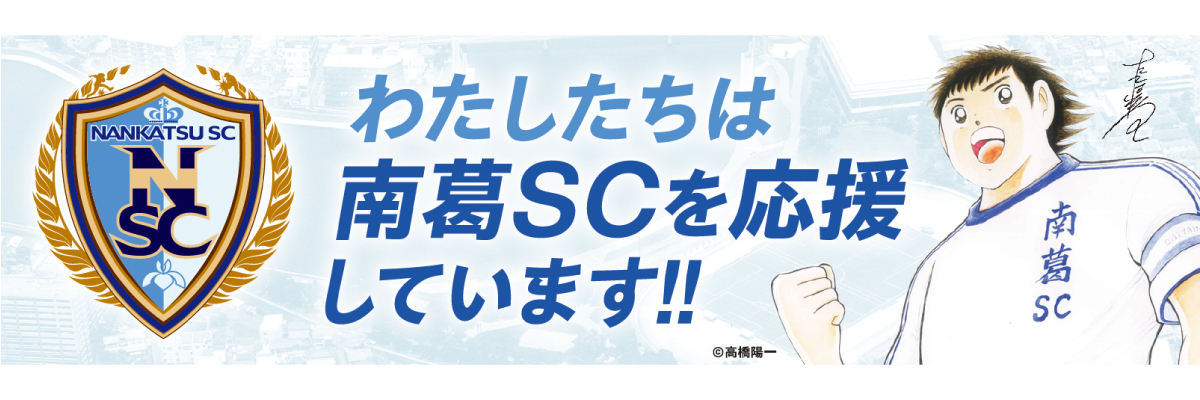 南葛SCは、サッカー漫画『キャプテン翼』の主人公・大空翼が小学生時代に所属したチームと同名のサッカークラブです。原作者である高橋陽一先生が、クラブのオーナー兼代表取締役社長を務めています。クラブのテーマは“葛飾からJリーグへ”。葛飾区及び東京都全域をホームタウンとし、葛飾区民&都民、行政、パートナー企業とともに、Jリーグ参入を短期目標に活動しています。『キャプテン翼』のように日本全国、そして全世界の人たちから愛されるようなチーム作りを志し、子どもたちに「夢」と「希望」を、ファン・サポーターに「希望」と「誇り」を授けながら、社会の発展に貢献していきます。