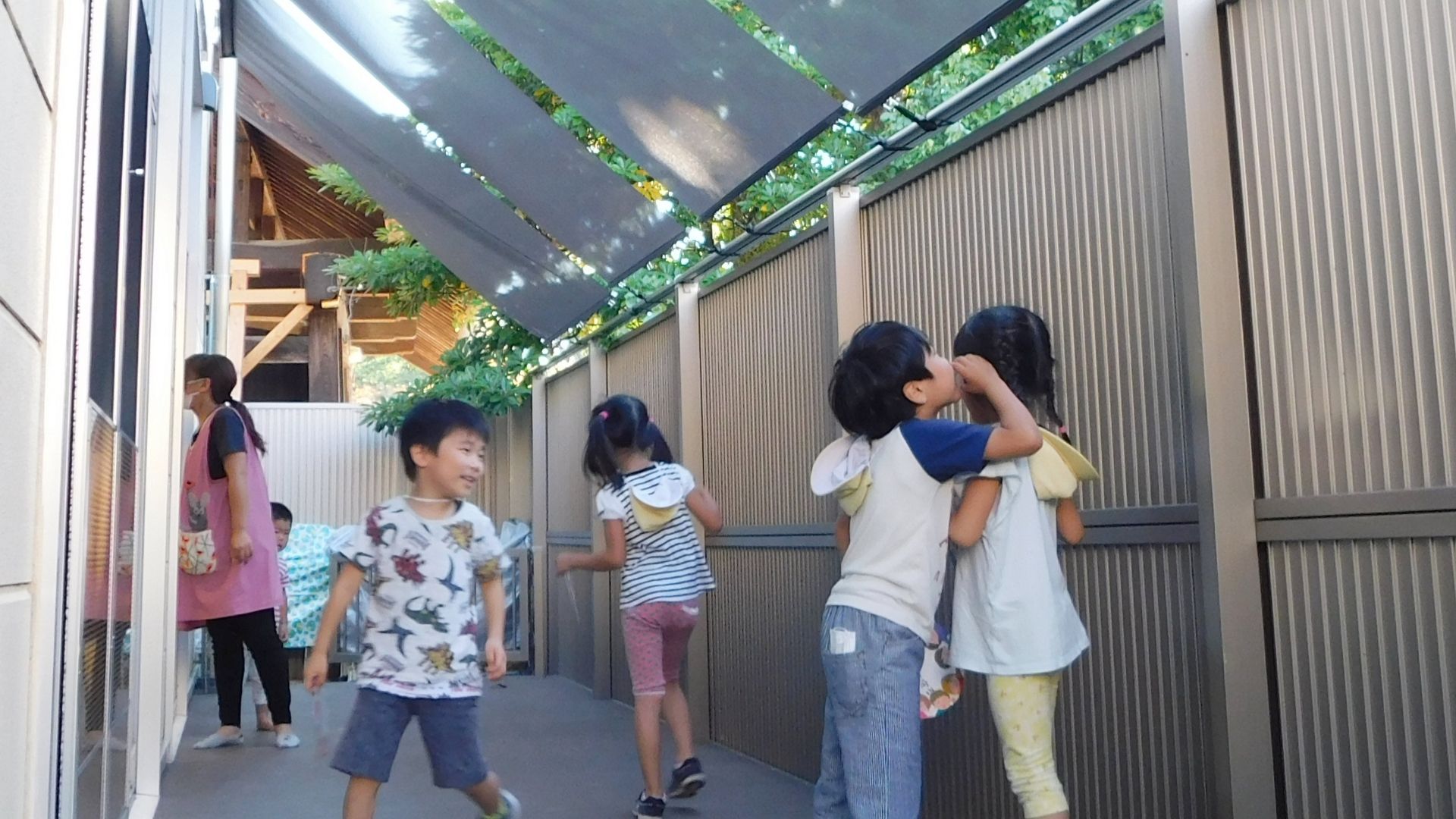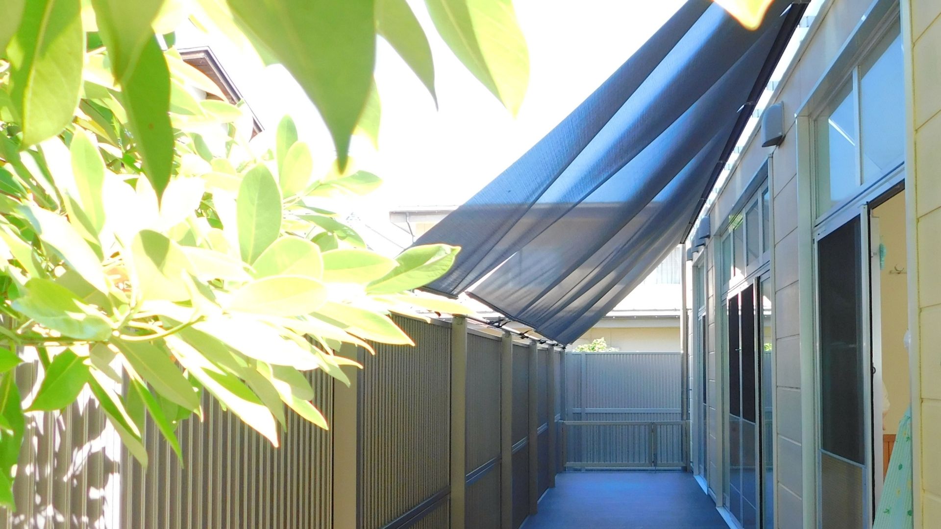 「南側の陽射しがとても強く、子どもたちが歩くデッキも熱くて困っていましたが、シェードを取り付けていただいてからとても快適です。」(飯塚はらっぱ保育園 園長)