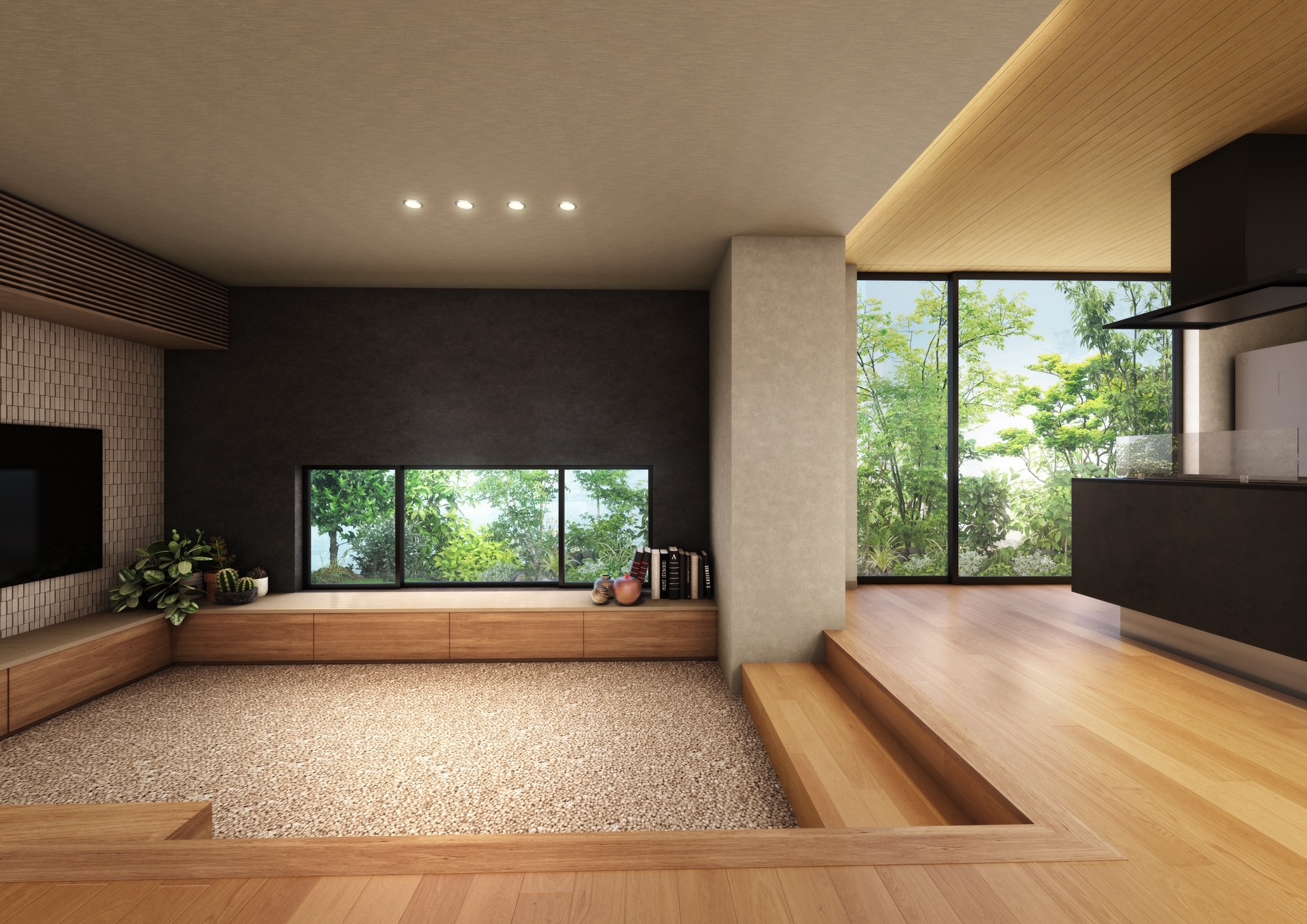 日本の静けさと北欧の温もりが調和する空間の中で、素材の質感や光の陰影、余白を大切にしています。住まいの中にわずかな「高さの違い」を設けることで、同じ空間でありながら心理的な切り替えが生まれ、家族それぞれが心地よい距離感で過ごせることを目指しました。一緒に過ごしながらも、干渉しすぎない。そんな現代の暮らしに寄り添う空間提案です。