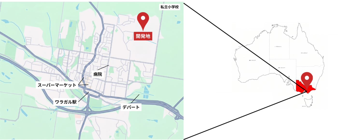 本開発用地はメルボルン中心エリアから南東にあるBaw Baw Shire(ボー・ボー・シャイア)の中に位置します。メルボルンの中心部から少し離れ、豊かな緑と活気あるコミュニティ・家族との穏やかな暮らしを大切にしたい人々に魅力ある街となっています。さらに周辺にはショッピング施設や教育施設もあり利便性も兼ね備えていることから、Warragulの住宅開発用地を確保しました。