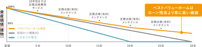 一般社団法人長寿命住宅普及協会が提供する「Best Value Home」は住宅の資産価値を適正に評価し、将来にわたりその価値を保証するための仕組みです。100年の長期間にわたり住宅価値を可視化し、全棟で「将来の売却価格保証」を付帯しています。保証した建物価値と売却した建物価格の差が生じた場合、協会が差額を最大500万円まで補填し建物価値を保証します。20年後でも購入価格の50〜60%の価値を維持・保証し、ユーザーに経済的な安心をもたらします。(※2)