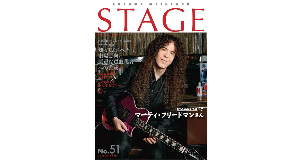 「STAGE」は、オーナー様との信頼関係を深めることを目的に発行しているコミュニケーション誌です。不動産市況や資産形成に関する情報だけでなく、地域の魅力、文化、健康、人物インタビューなどを通じて、暮らしに寄り添う多面的な情報をお届けしています。今号では、巻頭インタビューに世界的ギタリストのマーティ・フリードマンさんを迎えたほか、市場動向、エリア特集、健康企画、オーナー様インタビューなど、幅広いテーマを掲載しています。