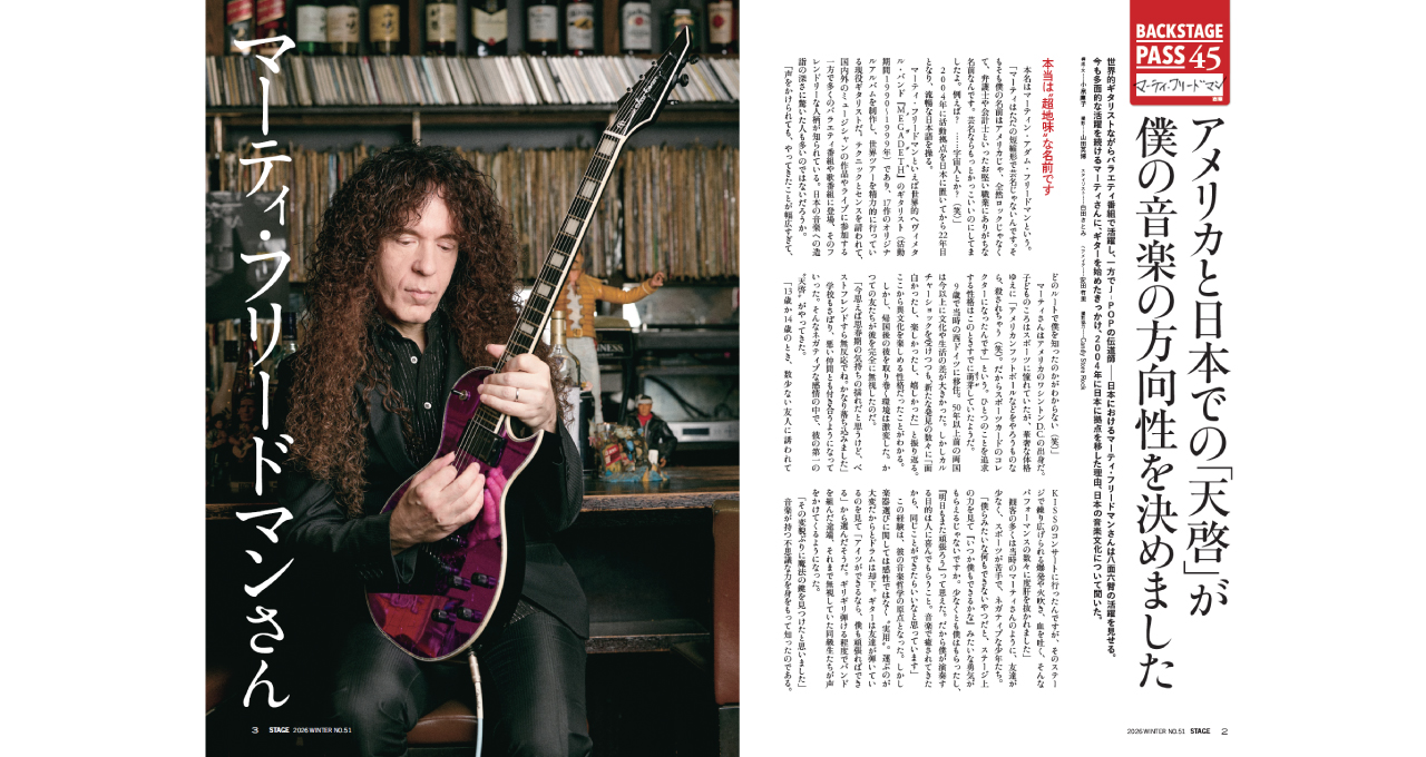 巻頭では、マーティ・フリードマンさんがギターを始めたきっかけや、日本に拠点を移した理由、日本の音楽文化への思いについて語っています。日本の音楽を「心が温まる」と表現する言葉からは、日本文化への深い敬意と愛情が伝わる内容となっており、「STAGE」ならではの読み応えあるインタビュー企画となりました。