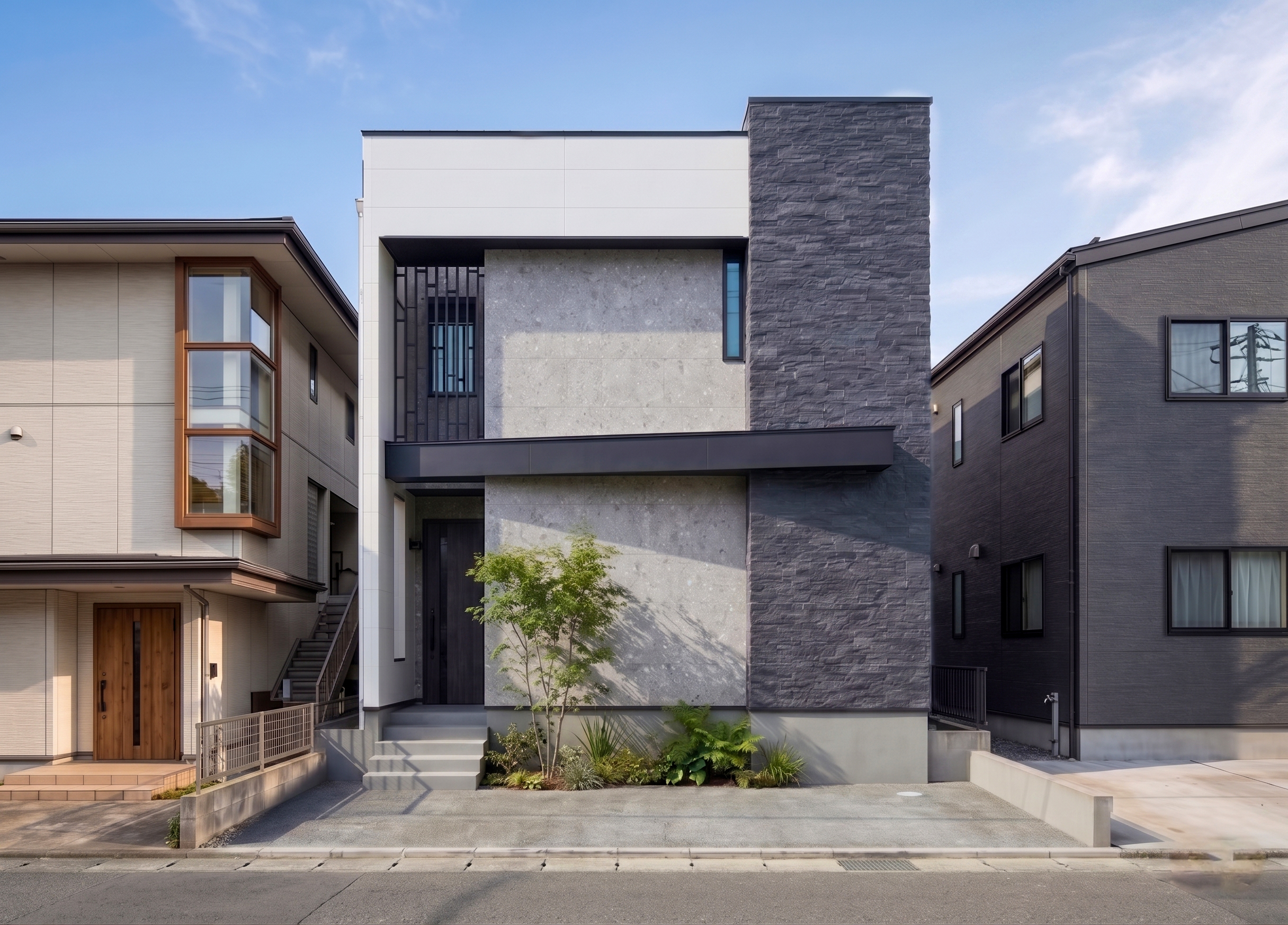 石目調のタイルと格子で水平ラインが際立つ、洗練された外観。